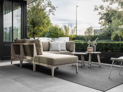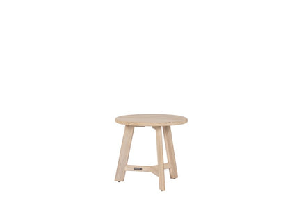 Gemaakt van aged teak, straalt de tafel een natuurlijke warmte en karakter uit. De subtiele vergrijsde afwerking benadrukt de authentieke structuur van het hout en geeft de tafel een klassieke uitstraling. Dankzij het duurzame materiaal is de Alan bijzettafel bestand tegen uiteenlopende weersomstandigheden, wat het een perfecte keuze maakt voor buitengebruik.