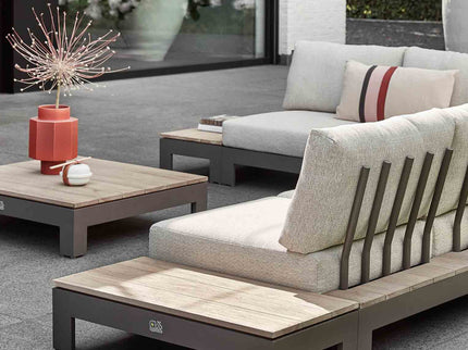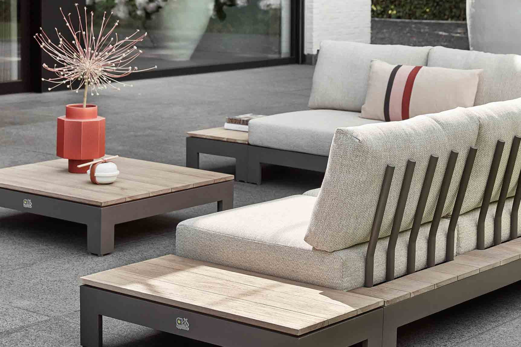 Het aluminium frame in een stijlvolle taupe kleur, samen met het gebruikte teak hout, zorgt voor een moderne uitstraling die perfect aansluit bij de hedendaagse tuinomgeving. De kussens zijn vervaardigd van het innovatief Cushion Bee Wett® in de kleur natural oak, wat niet alleen comfort garandeert, maar ook optimale duurzaamheid biedt.