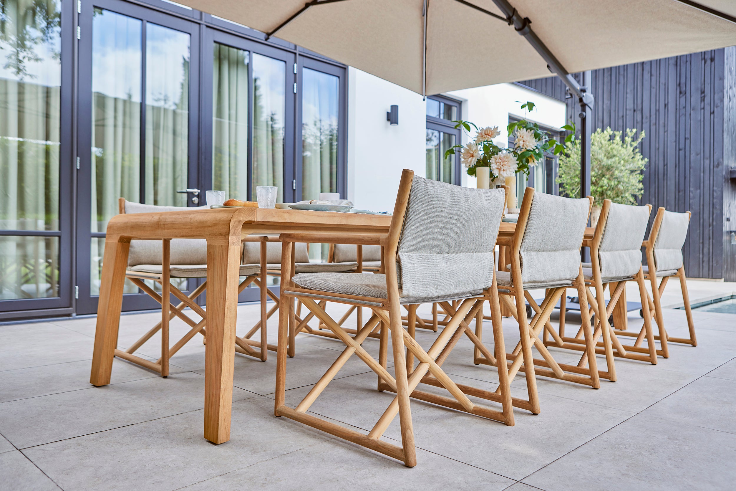 • Materiaal: SVLK-gecertificeerd teak of gepoedercoat aluminium.