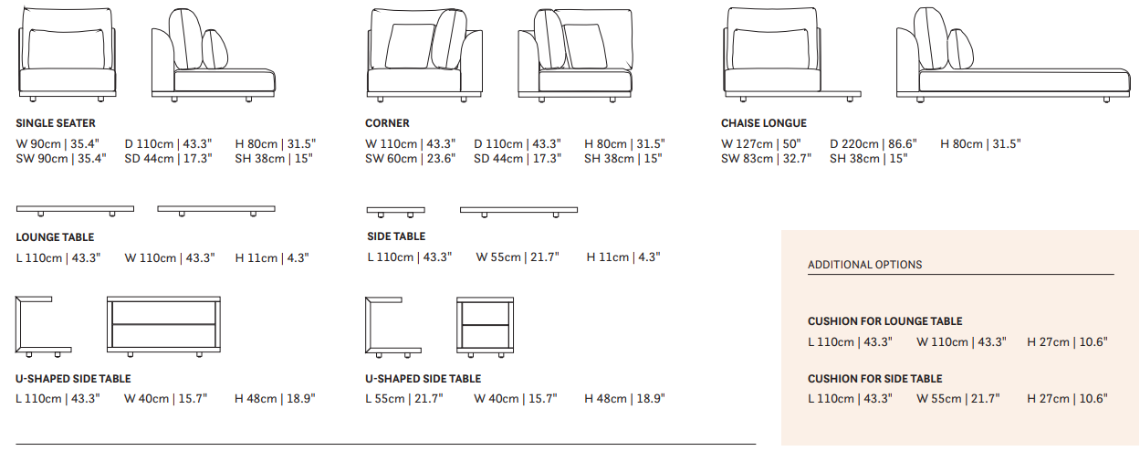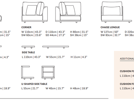 - Afmeting per bank incl. zijtafel : 345x110cm. Hoogte rugleuning: 83cm. Zithoogte:36cm