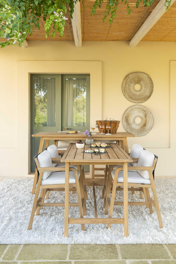 Teakhout is een natuurproduct en zal het hout uitzetten en krimpen door de luchtvochtigheid. Hierdoor bestaat de mogelijkheid dat er (kleine) haarscheurtjes ontstaan en eventueel wat kromming van de planken. Om het hout te beschermen kun je een teak shield gebruiken. Hierdoor zal de vergrijzing van het hout doorgaan, maar bescherm je het hout tegen weersinvloeden en ander vuil. Schoonmaken van het hout kan met een teakcleaner, hier zul je gemakkelijk al het vuil en evt. Beschermlagen mee verwijderen. Voor het onderhoud van de kussens raden we de Textiel cleaner en protector aan. Zie voor verdere informatie over onderhoud het kopje “Alles over tuinmeubelen” / tuinmeubel onderhoud op onze website!