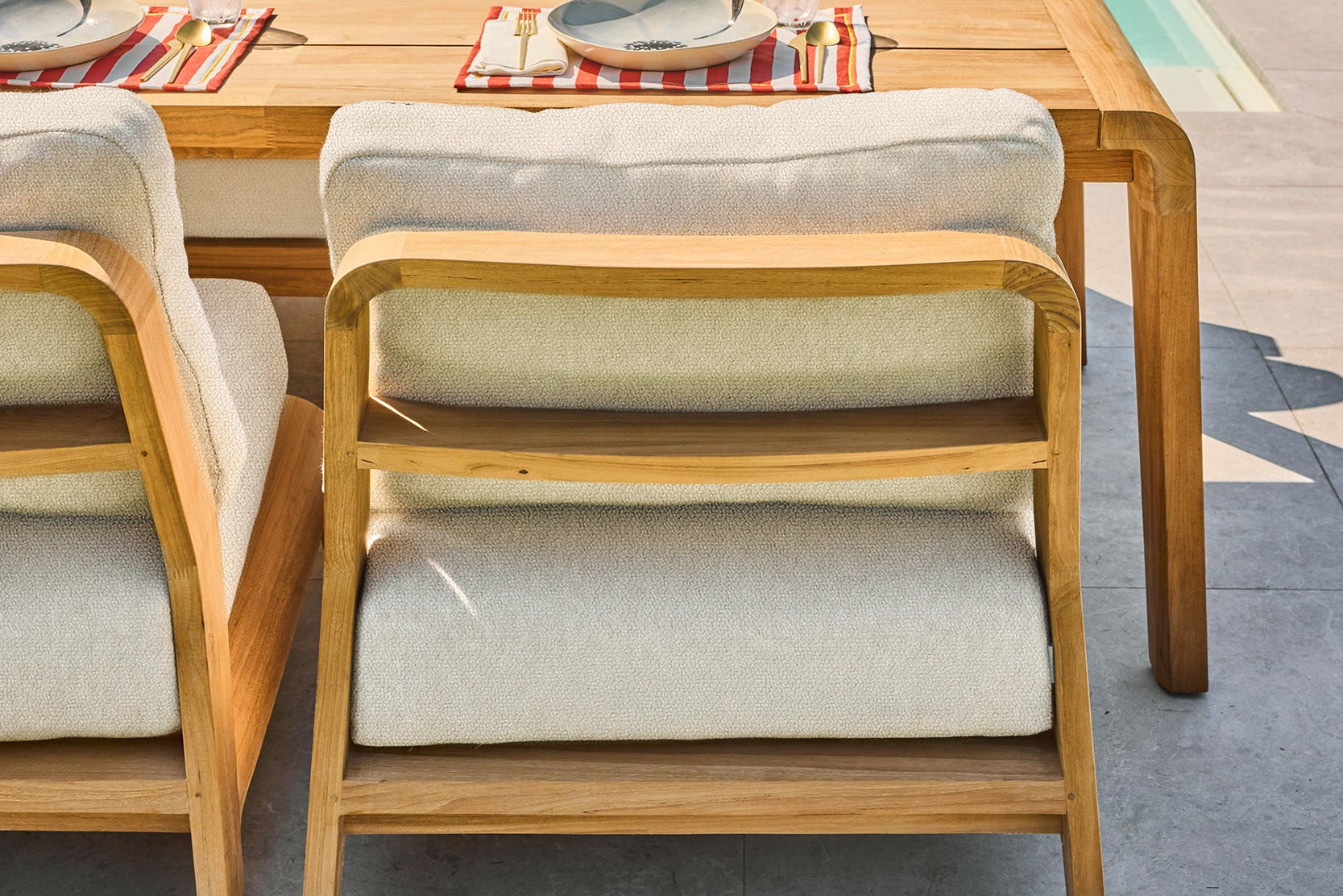 De Basta low dining chair is uitgerust met rijke kussens die voorzien zijn van Quick Dry Foam. Hierdoor zijn de kussens niet alleen uiterst comfortabel, maar ook snel droog na een regenbui. Voor de bekleding heeft u de keuze uit twee exclusieve bouclé stoffen die zacht aanvoelen en een high-end uitstraling hebben: