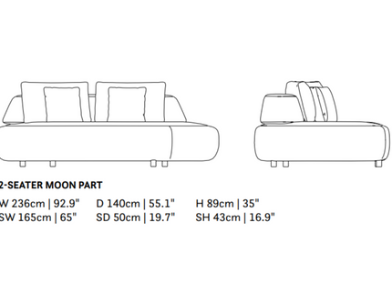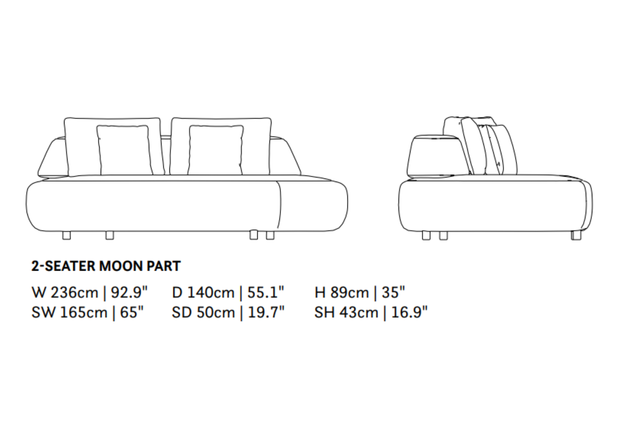 Met afmetingen van W 236cm, D 140cm en H 89cm is de Blocchi Double Seater Moon perfect om prachige sets te creëren. De zitting zelf is 165cm breed en 50cm diep, met een comfortabele hoogte van 43cm.