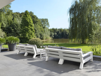 Met een elegant aluminium frame, beschikbaar in twee verfijnde kleuren, wit en anthracite, straalt deze set een moderne uitstraling uit. De premium Sunbrella® kussens zijn niet alleen all weather, maar ook beschikbaar in de tijdloze kleuren white en sooty, wat zorgt voor een chique afwerking.