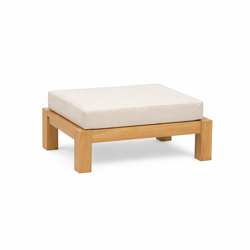 Je kunt de Daylounge hocker gebruiken met of zonder kussen. Zonder kussen komt het minimalistische karakter van het teak frame mooi naar voren. Met kussen voeg je extra comfort toe en creëer je een luxe, uitnodigende uitstraling. Het optionele kussen is uitgevoerd in hoogwaardige Sunbrella stof. Deze stof is kleurvast, weerbestendig en eenvoudig in onderhoud, waardoor de Daylounge hocker ideaal is voor buitengebruik. De dikke, strak afgewerkte kussens sluiten naadloos aan bij de Daylounge stoel en Daylounge bank, zodat het geheel één stijlvolle loungeset vormt.