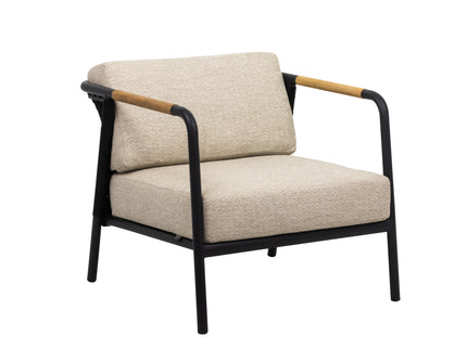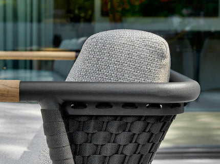 - Een frame van hoogwaardig aluminium in een verfijnde zwarte kleur, aangevuld met subtiele teak accenten voor een natuurlijke uitstraling.