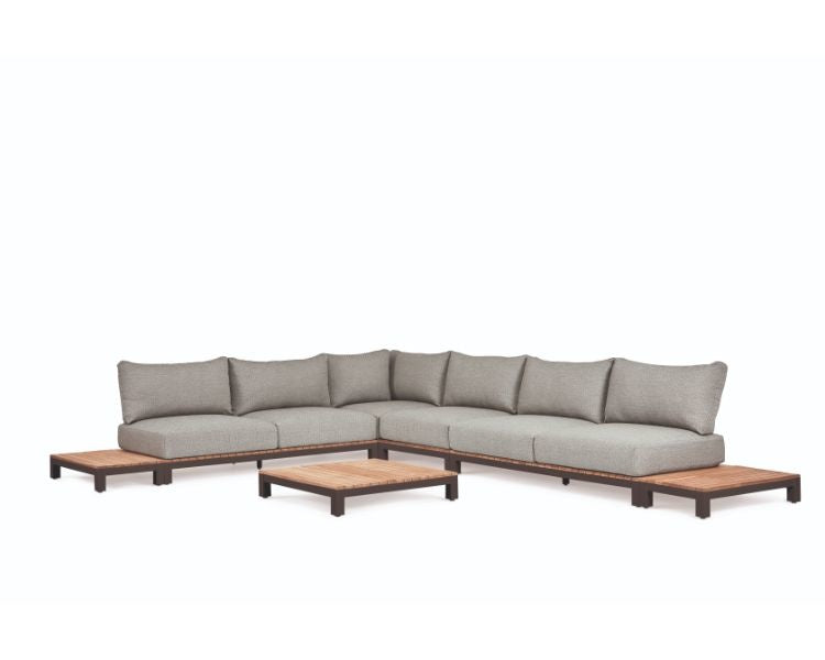 - Deze opstelling bestaat uit: 2x 2-zitsbank, 1 x 1-zits, 1x hoekmodule, 2 sidetables en een salontafel 95 x 95 cm