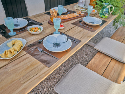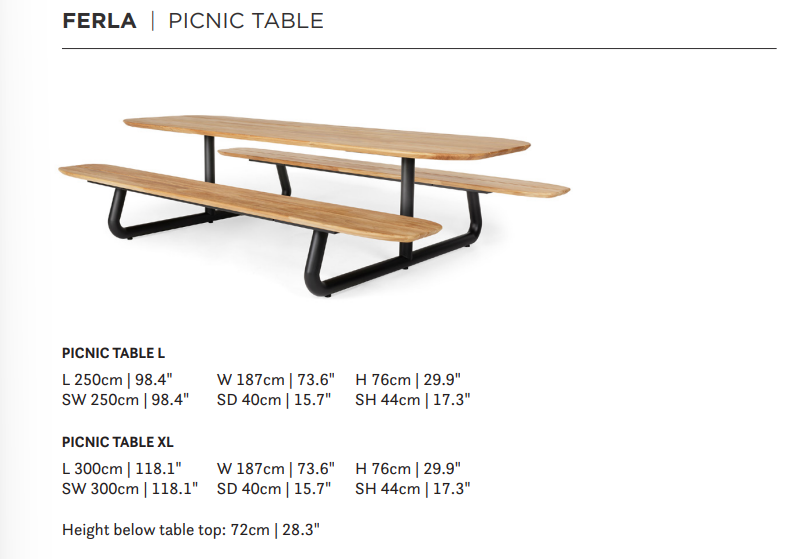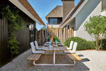 • Picnic Table L: 250 cm lang, 187 cm breed, en 76 cm hoog.