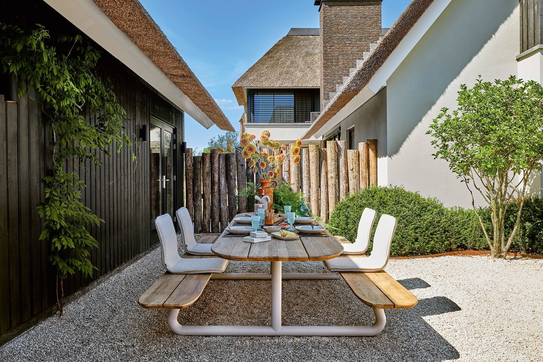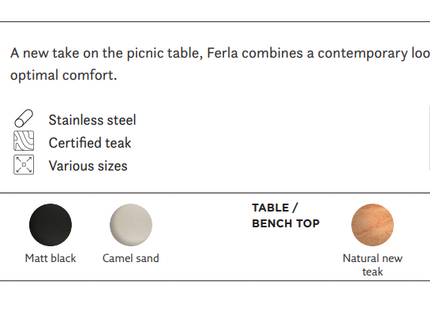 De Ferla picknicktafel biedt een eigentijdse kijk op de klassieke picknicktafel en combineert een strak, modern design met comfort. Gemaakt van hoogwaardig roestvrij staal en gecertificeerd teakhout, is de Ferla zowel duurzaam als stijlvol. De tafel is verkrijgbaar in verschillende maten, waardoor hij geschikt is voor diverse ruimtes en gelegenheden.