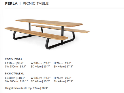 • Picnic Table XL: 300 cm lang, 187 cm breed, en 76 cm hoog.