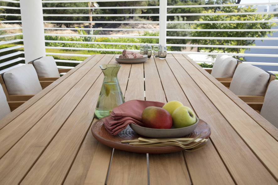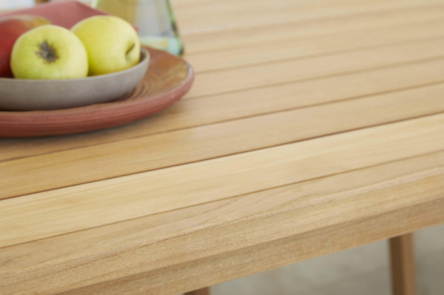 Teakhout is een natuurproduct en zal het hout uitzetten en krimpen door de luchtvochtigheid. Hierdoor bestaat de mogelijkheid dat er (kleine) haarscheurtjes ontstaan en eventueel wat kromming van de planken. Daarnaast is het niet goed om het teakhout af te dekken met een hoes in de winterperiode. Om het hout te beschermen kun je een teak shield gebruiken. Hierdoor zal de vergrijzing van het hout doorgaan, maar bescherm je het hout tegen weersinvloeden en ander vuil. Schoonmaken van het hout kan met een teakcleaner, hier zul je gemakkelijk al het vuil en evt. Beschermlagen mee verwijderen. Voor het onderhoud van de kussens raden we de Textiel cleaner en protector aan. Zie voor verdere informatie over onderhoud het kopje “Alles over tuinmeubelen” / tuinmeubel onderhoud op onze website!