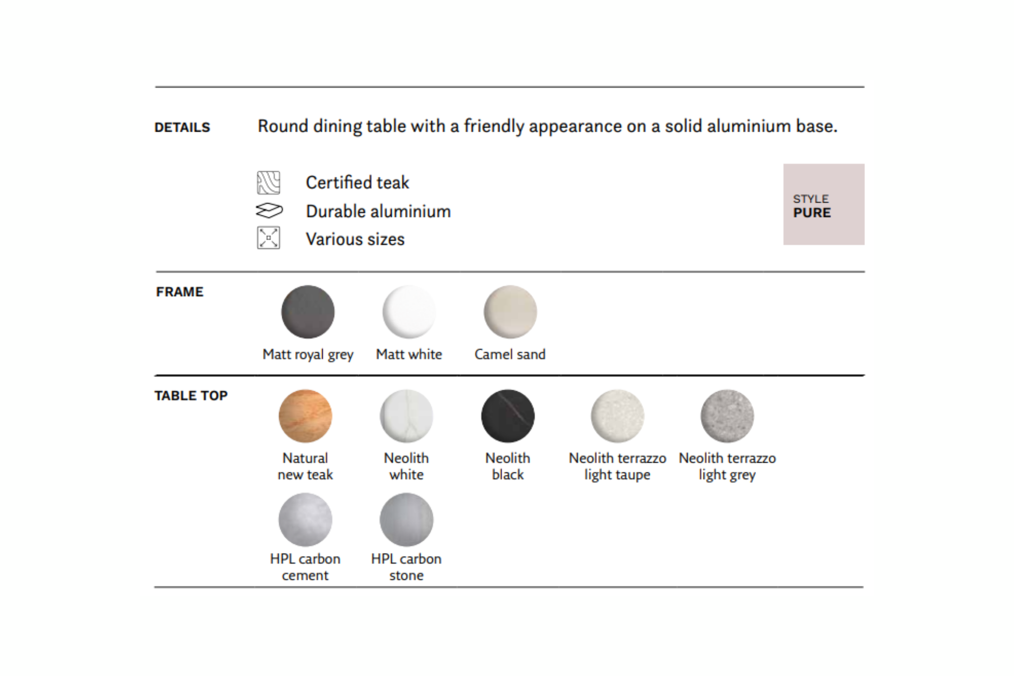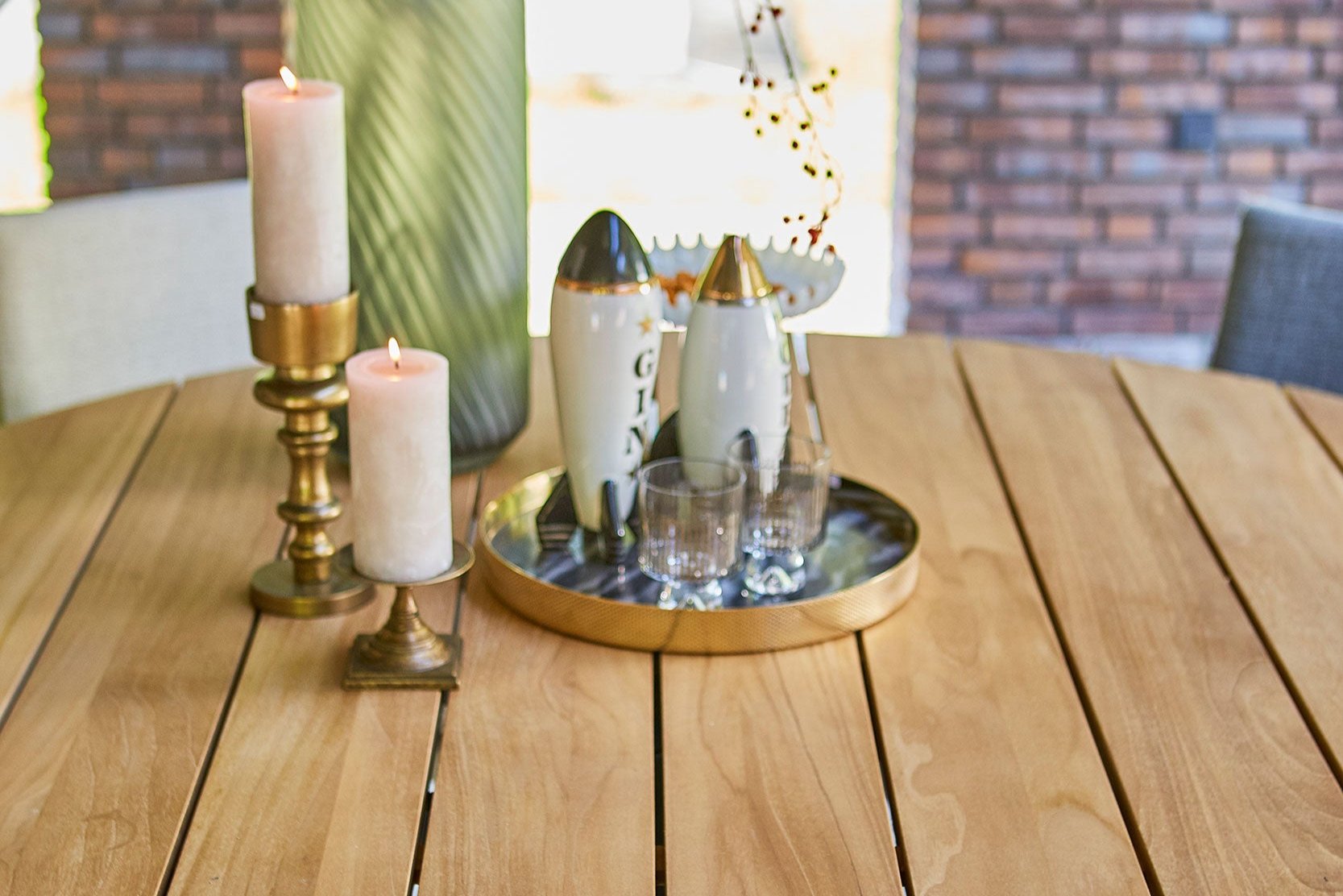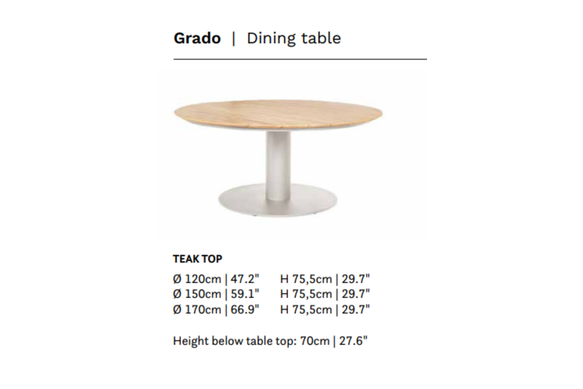 De Grado tuintafel is een prachtige ronde tuintafel met een teakhouten tafelblad en een aluminium onderstel, uitgevoerd in mat grijs. Deze tuintafel is vanwege zijn vorm in vrijwel elke tuin te plaatsen en biedt ruimte voor 4 tot 6 personen. Het teakhouten tafelblad in combinatie met het mat grijze onderstel geeft een industriële en stoere look. In combinatie met de tuinstoelen van Suns, die je naar eigen wens bij deze tafel kunt uitzoeken, heb je voor iedere gelegenheid de perfecte tuintafel!