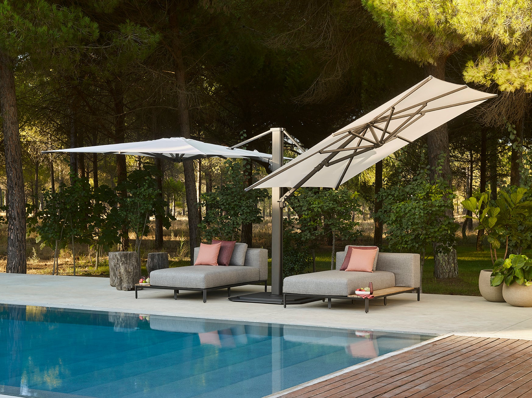 - Vrijhangende parasol met een flexibele hoogteverstelling en een indrukwekkende 360° rotatie, zodat u de schaduw altijd op de gewenste plek kunt richten.
