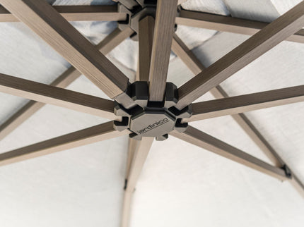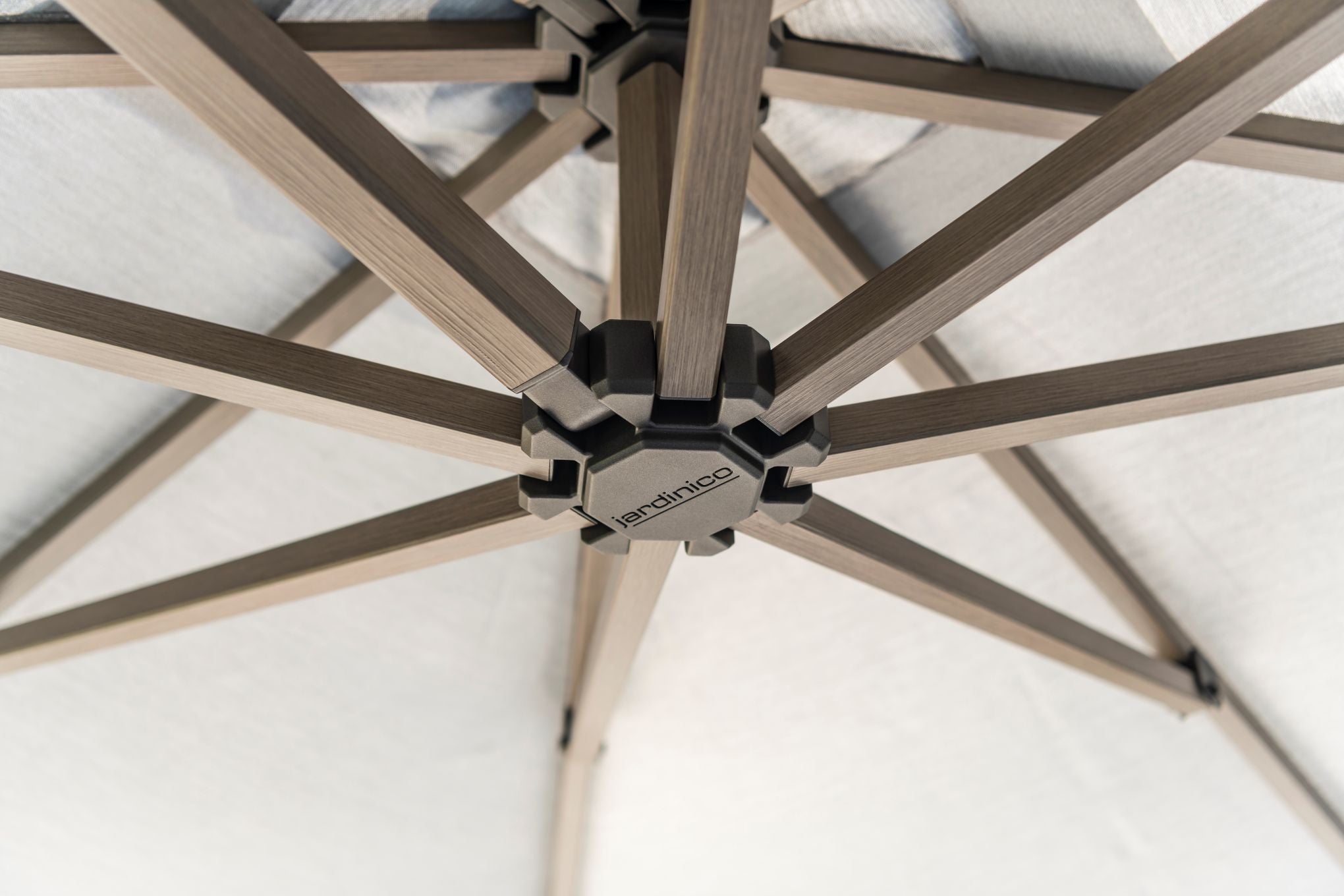 De Jardinico JCP.6 is ontworpen met oog voor detail en luxe; elk aspect van deze parasol straalt kwaliteit uit. Het frame is vervaardigd van hoogwaardig, gepoederlakt aluminium, dat niet alleen duurzaamheid garandeert maar ook een verfijnde uitstraling biedt.