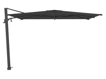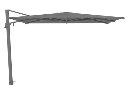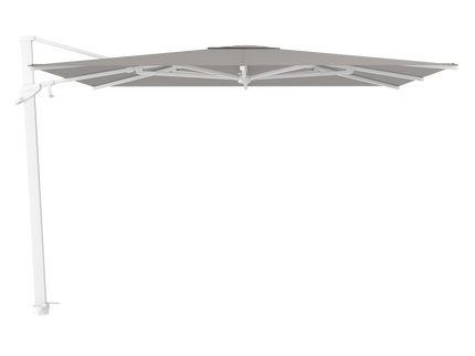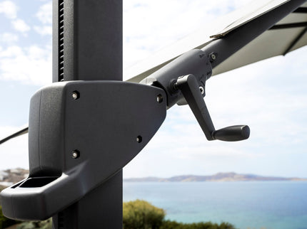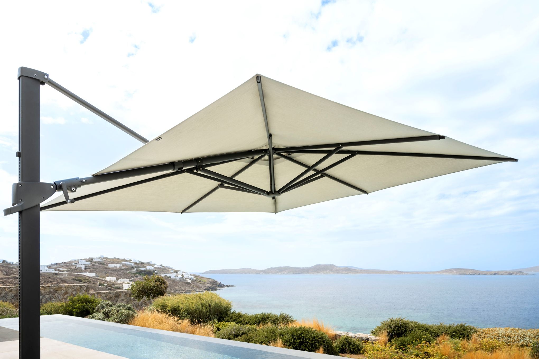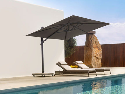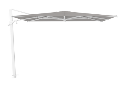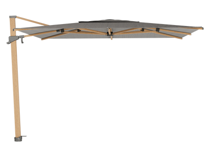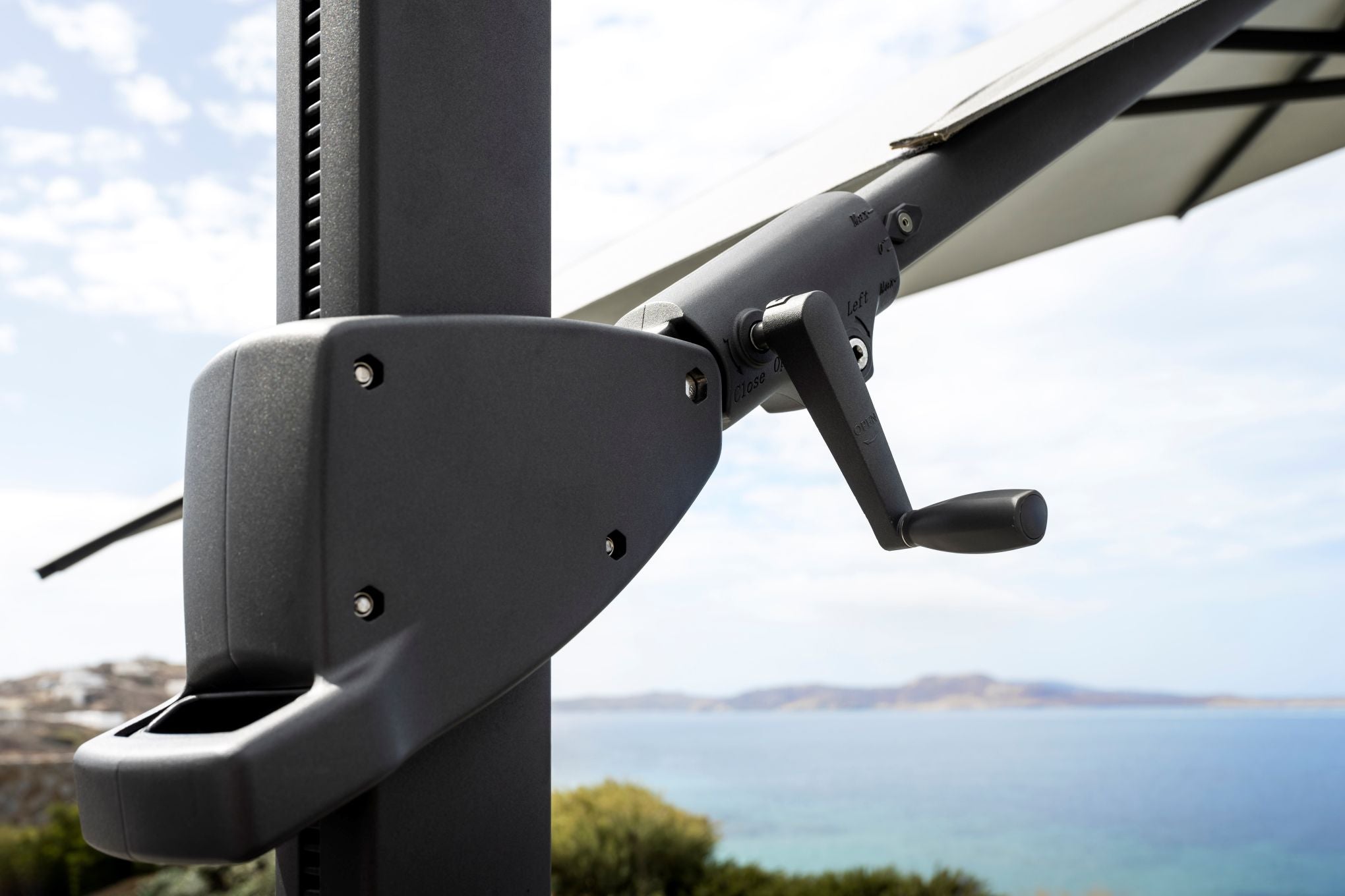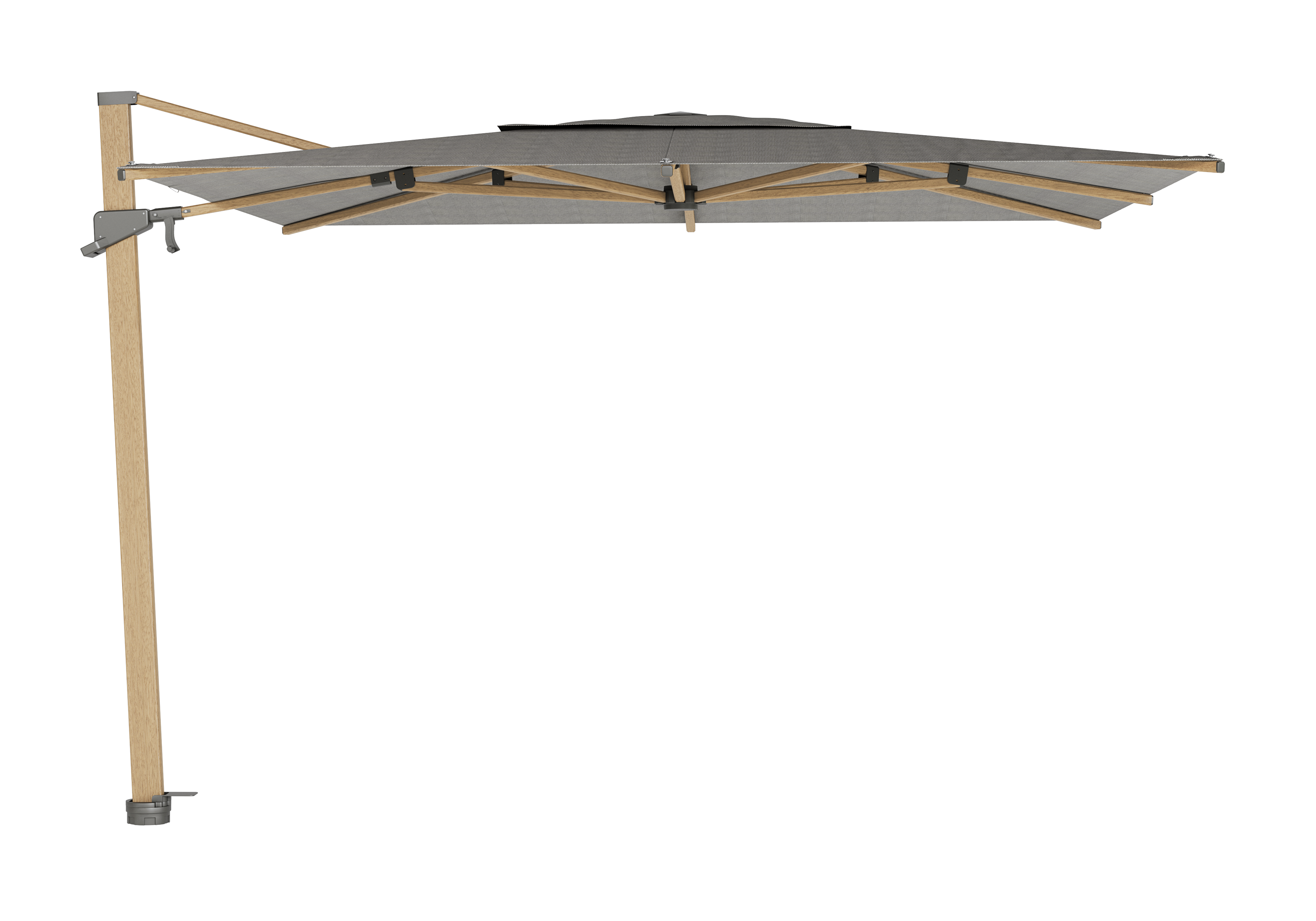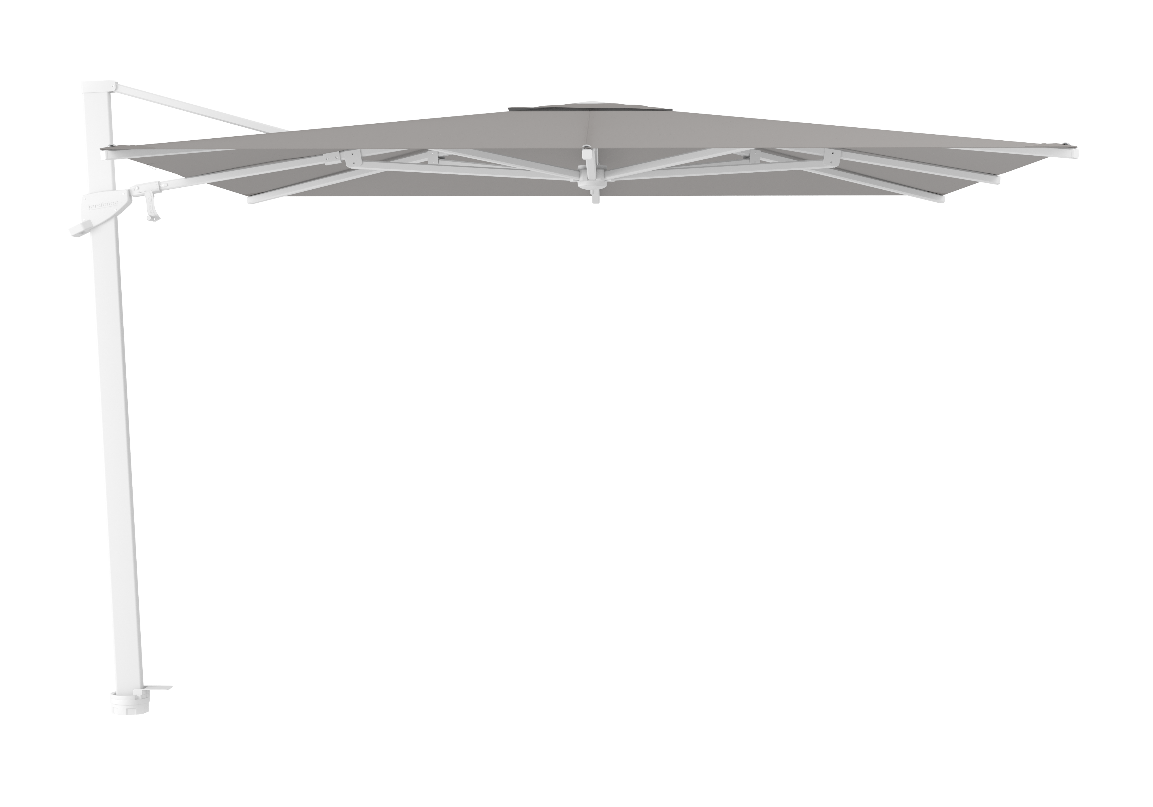 De parasol wordt zonder base geleverd, maar er zijn tal van opties beschikbaar om de stabiliteit te waarborgen. Je kunt kiezen uit een grondanker voor een permanente bevestiging of een voet van 125 kilo die je kunt uitbreiden met twee verschillende soorten wielen voor extra mobiliteit.