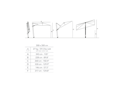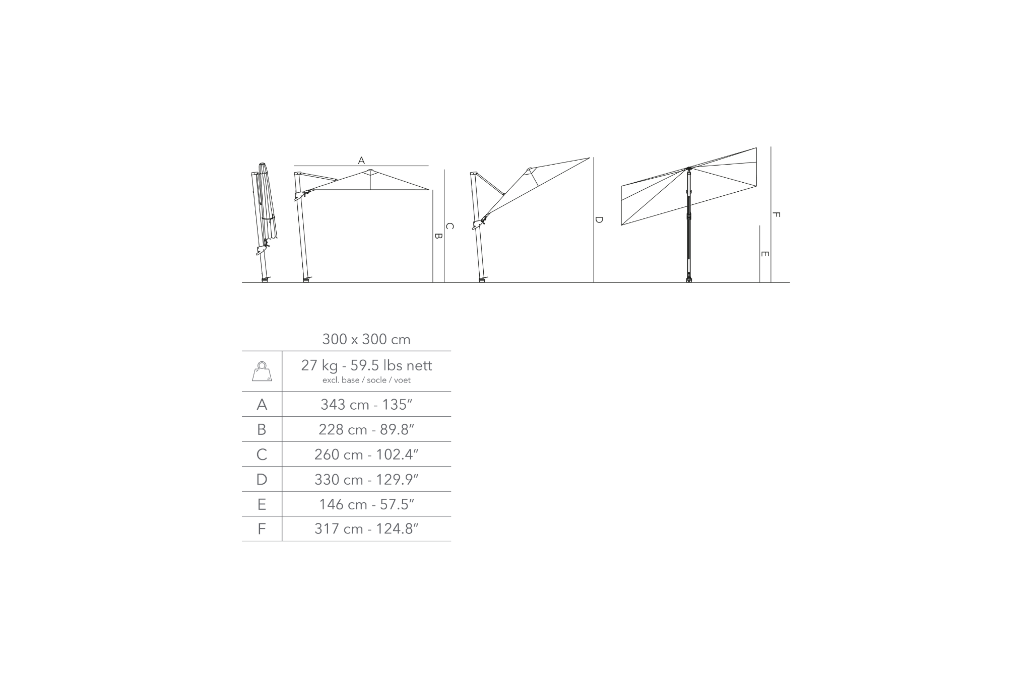 De afmetingen van de parasol zijn 300x300 cm, met een hoogte tot het doek van 203 cm en een hoogte tot aan de top van 262 cm. Met de bijbehorende hoes is je investering in stijl en comfort ook beschermd wanneer je het niet gebruikt.