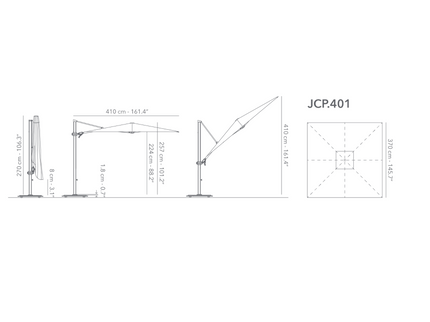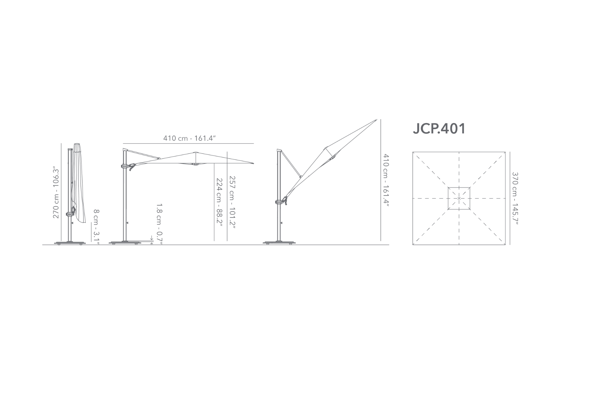 De JCP.4 parasol is beschikbaar in een royale maat van 370x370 cm, perfect voor het creëren van schaduw op uw terras of in uw tuin. Met een hoogte van 224 cm tot het doek en een totale hoogte van 257 cm, biedt deze parasol een ideale bescherming tegen de zon terwijl u geniet van de buitenlucht in stijl.