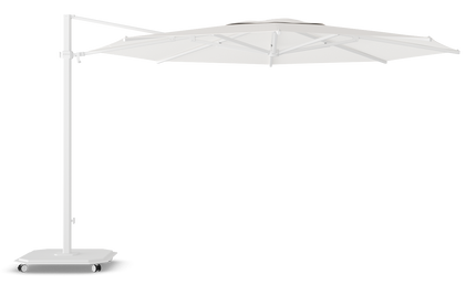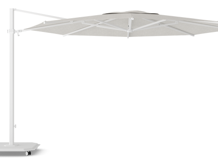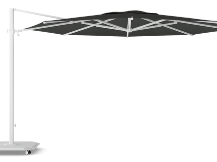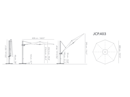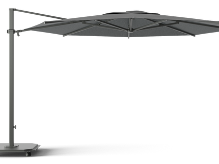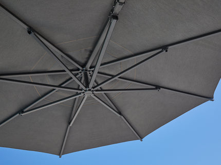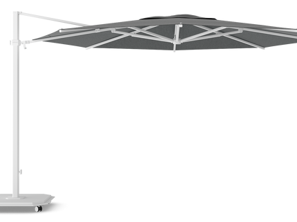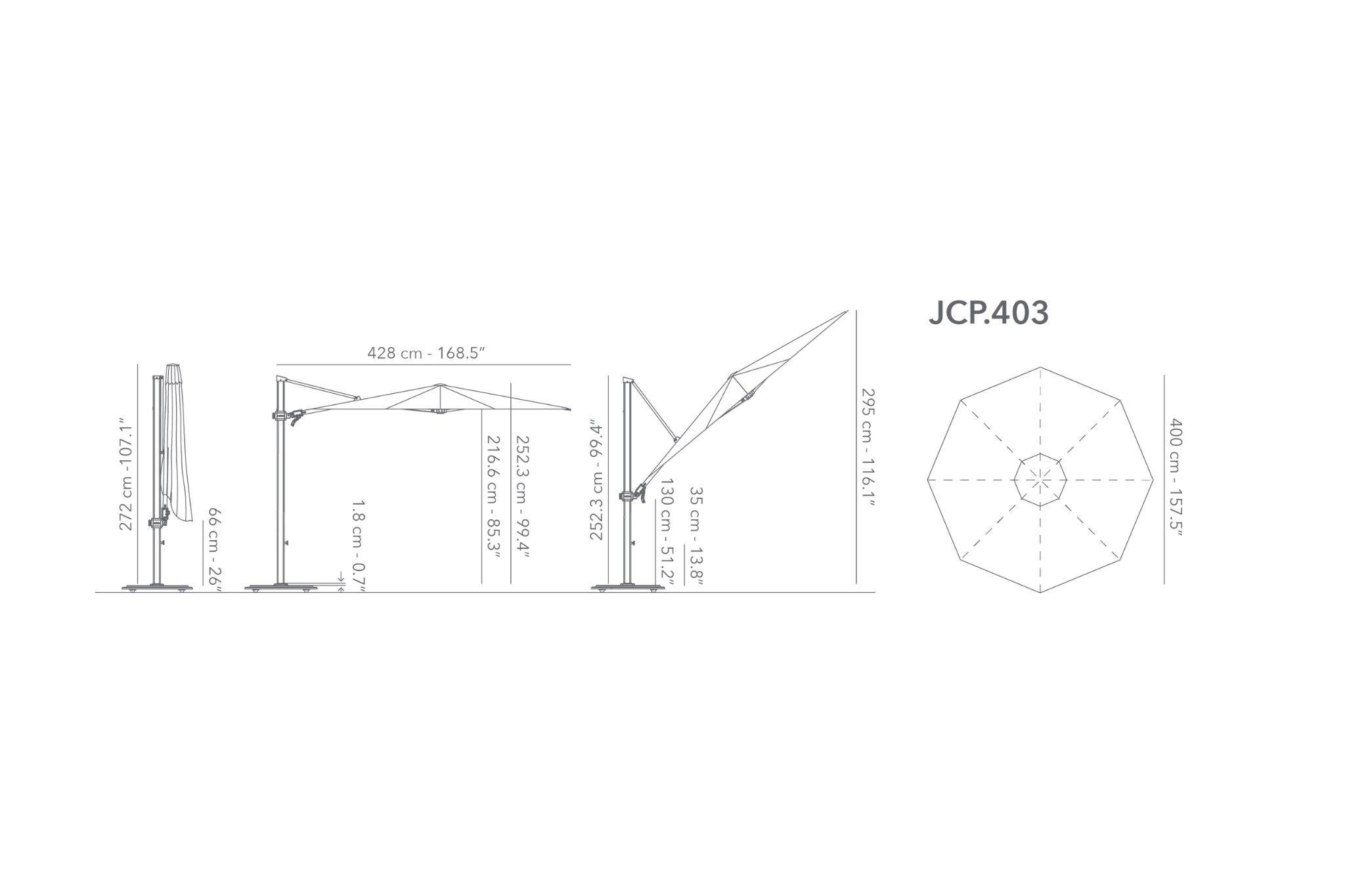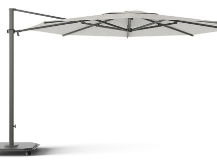 De Jardinico JCP.4 parasol is met trots vervaardigd uit gepoederlakt aluminium, wat een combinatie van stevigheid en elegantie biedt. Deze vrijhangende parasol, met een ruime Ø400 cm, is speciaal ontworpen om u te beschermen tegen de zon terwijl u comfortabel buiten geniet. Bovendien heeft u de vrijheid om hem in hoogte te kantelen en 360° te roteren, zodat u altijd de perfecte schaduw kunt creëren.