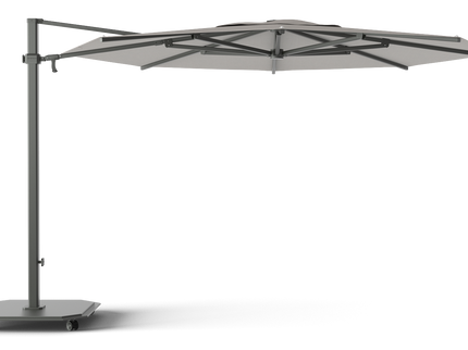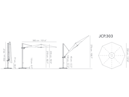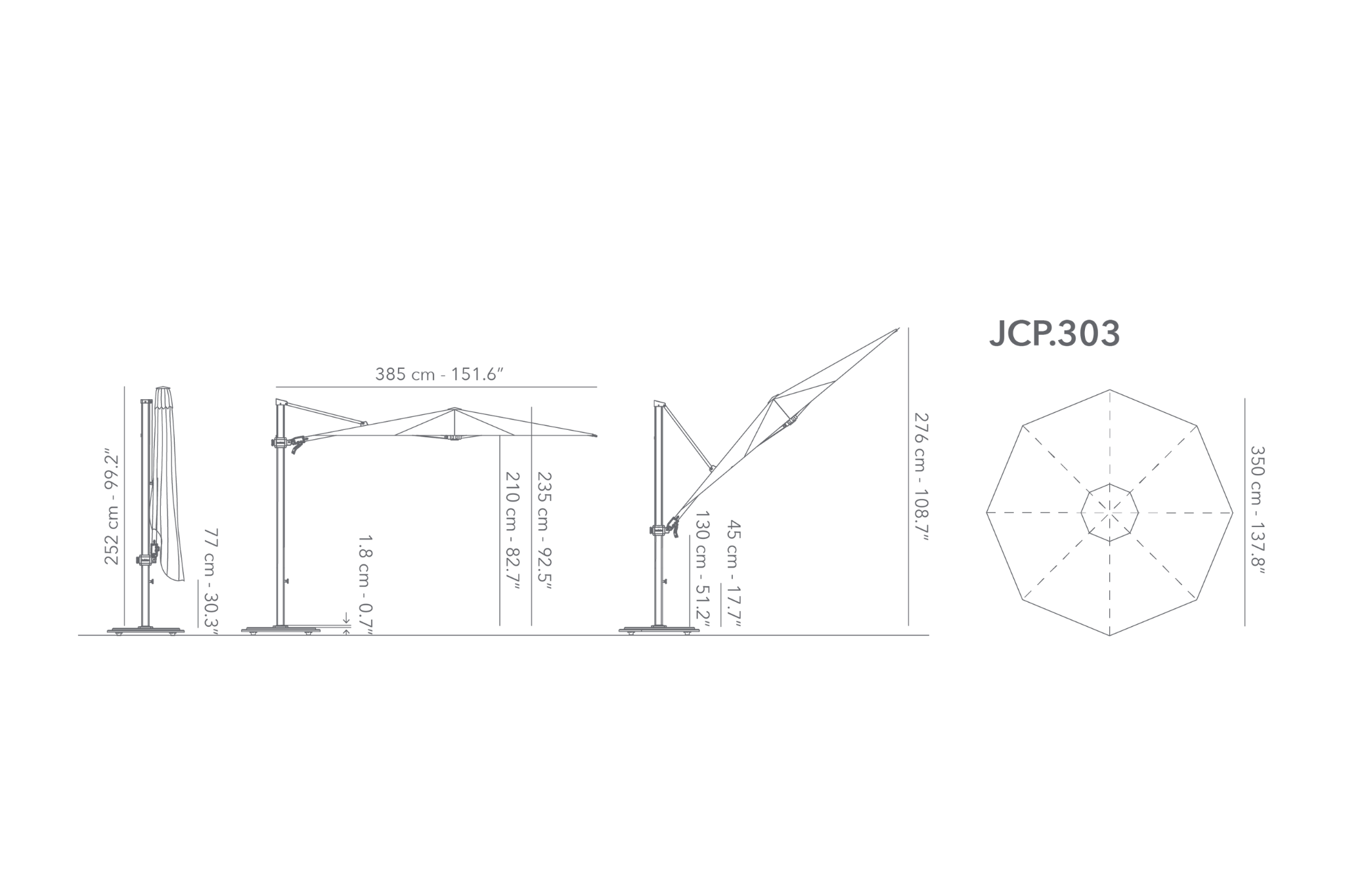 De JCP.3 serie Parasol is beschikbaar in drie afmetingen, waarbij de Ø350 cm variant zorgt voor een indrukwekkende schaduwbedekking met een hoogte van 211 cm tot het doek en 235 cm tot de top.