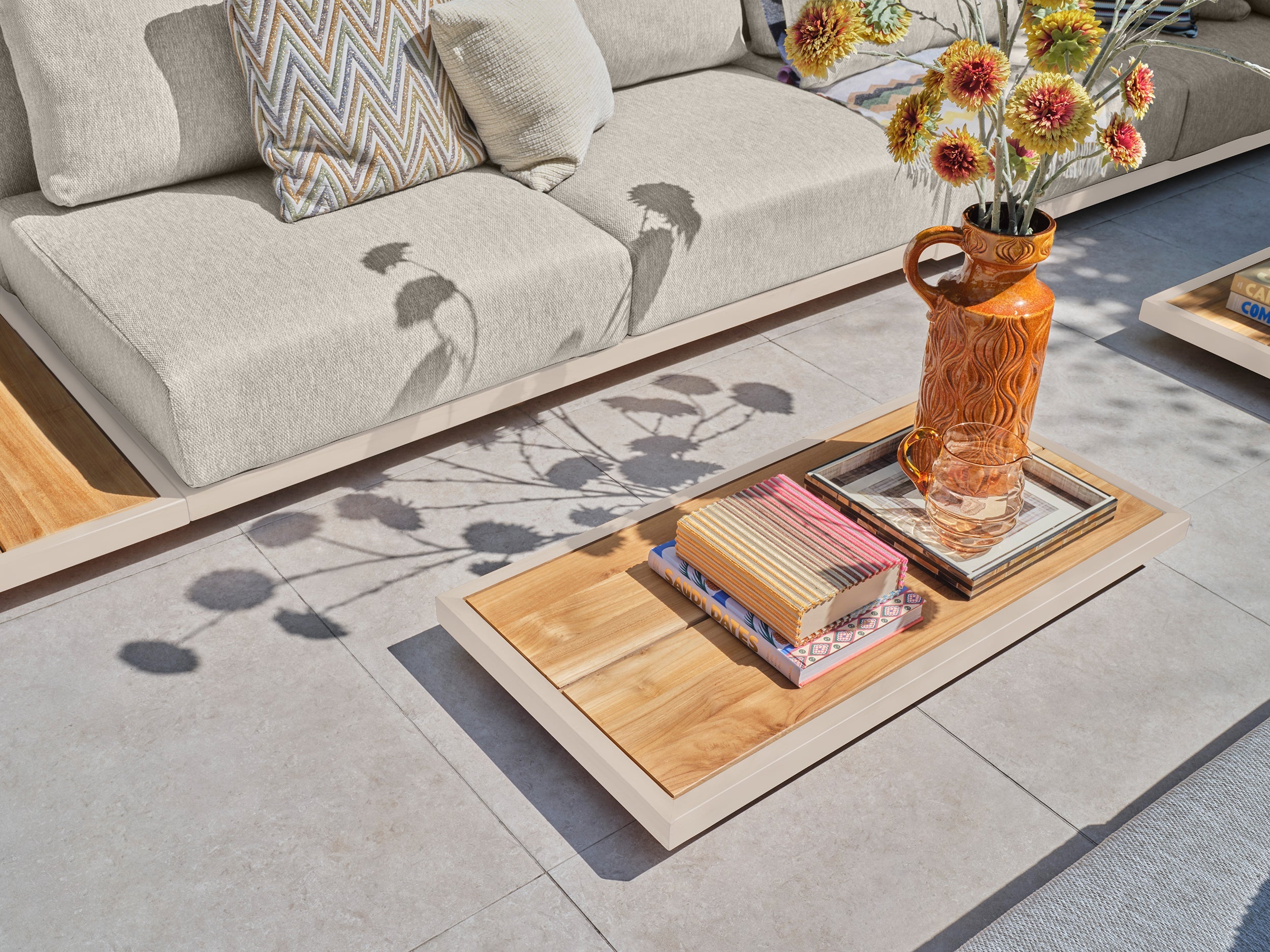 Deze prachtige stoere Kota loungeset is onderdeel van de nieuwste collectie van Suns.  Deze loungeset is volledig gemaakt van duurzaam en gecertificeerd teakhout, dit geeft deze set een prachtige luxe uitstraling! De loungeset is uitermate geschikt voor een heerlijk avondje loungen op een doordeweekse avond met je gezin onder het genot van een heerlijk hapje en drankje. Maar je kunt met gemak ook een groep vrienden uitnodigen om heerlijk te komen borrelen op een warme zomeravond!