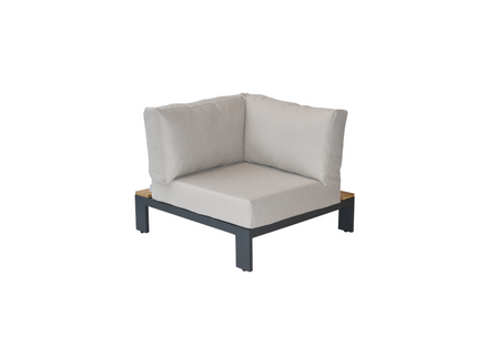 Het frame van dit prachtig vormgegeven hoekmeubel is vervaardigd uit hoogwaardig aluminium in een stijlvolle antraciet tint, afgewerkt met verfijnd teak. Dit zorgt niet alleen voor een moderne uitstraling, maar ook voor duurzaamheid en weerbestendigheid.
