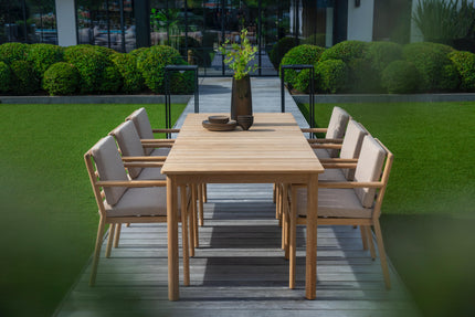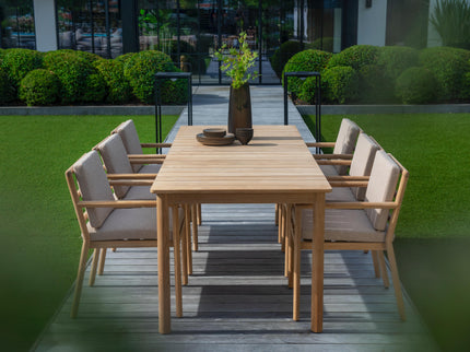 De Maré eetkamerstoel vormt een perfecte aanvulling op de Maré eettafel en is ideaal voor wie houdt van luxe en natuurlijke materialen in zijn interieur of buitenruimte.