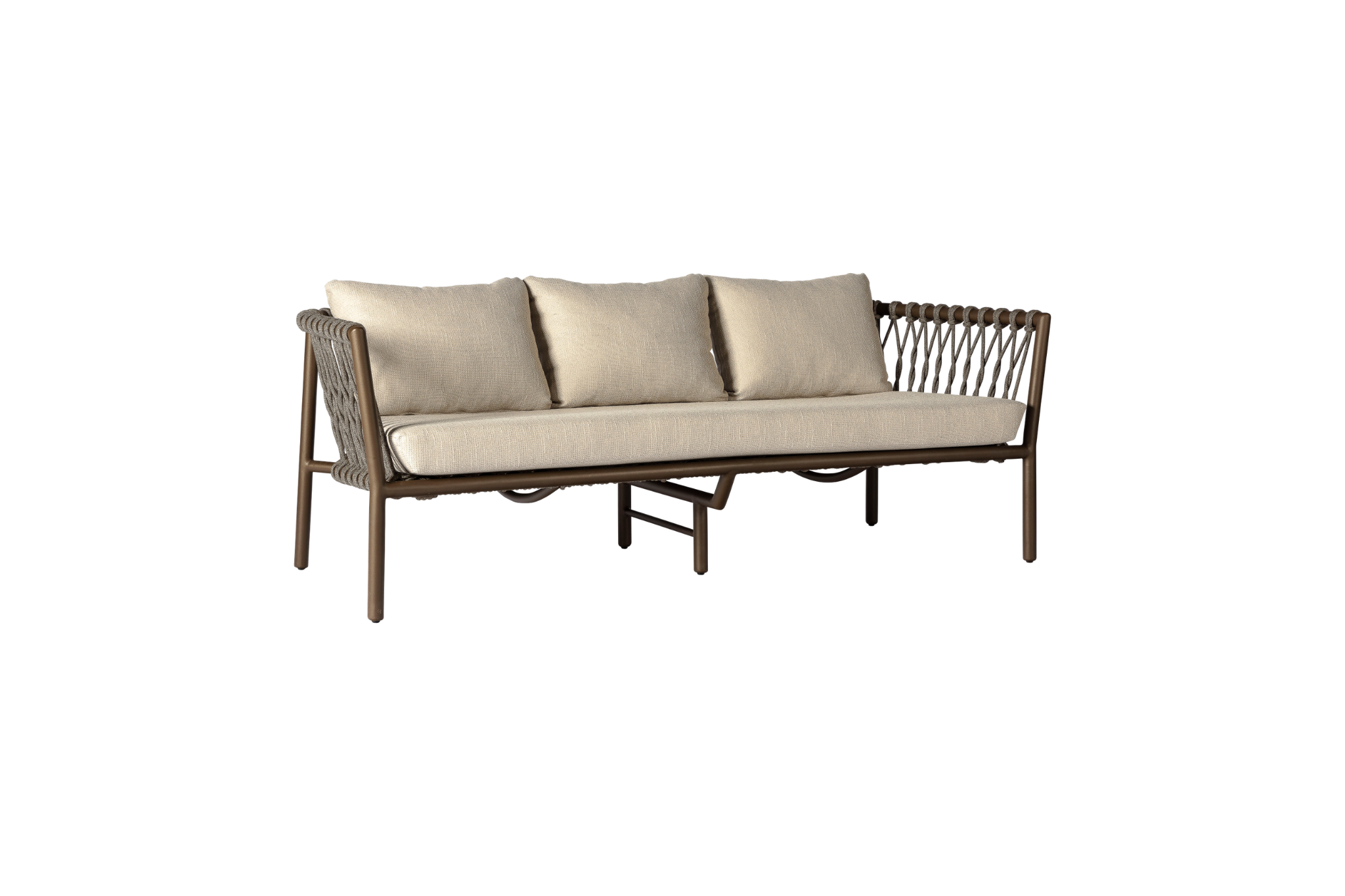 Met een prachtig bronzen aluminium frame straalt deze sofa moderniteit en verfijning uit. Het wengé rope biedt een warme, uitnodigende uitstraling die perfect aansluit bij de natuurlijke omgeving. De Cervo all-weather kussens in de kleur stone zorgen voor ongeëvenaard comfort, ongeacht het weer.