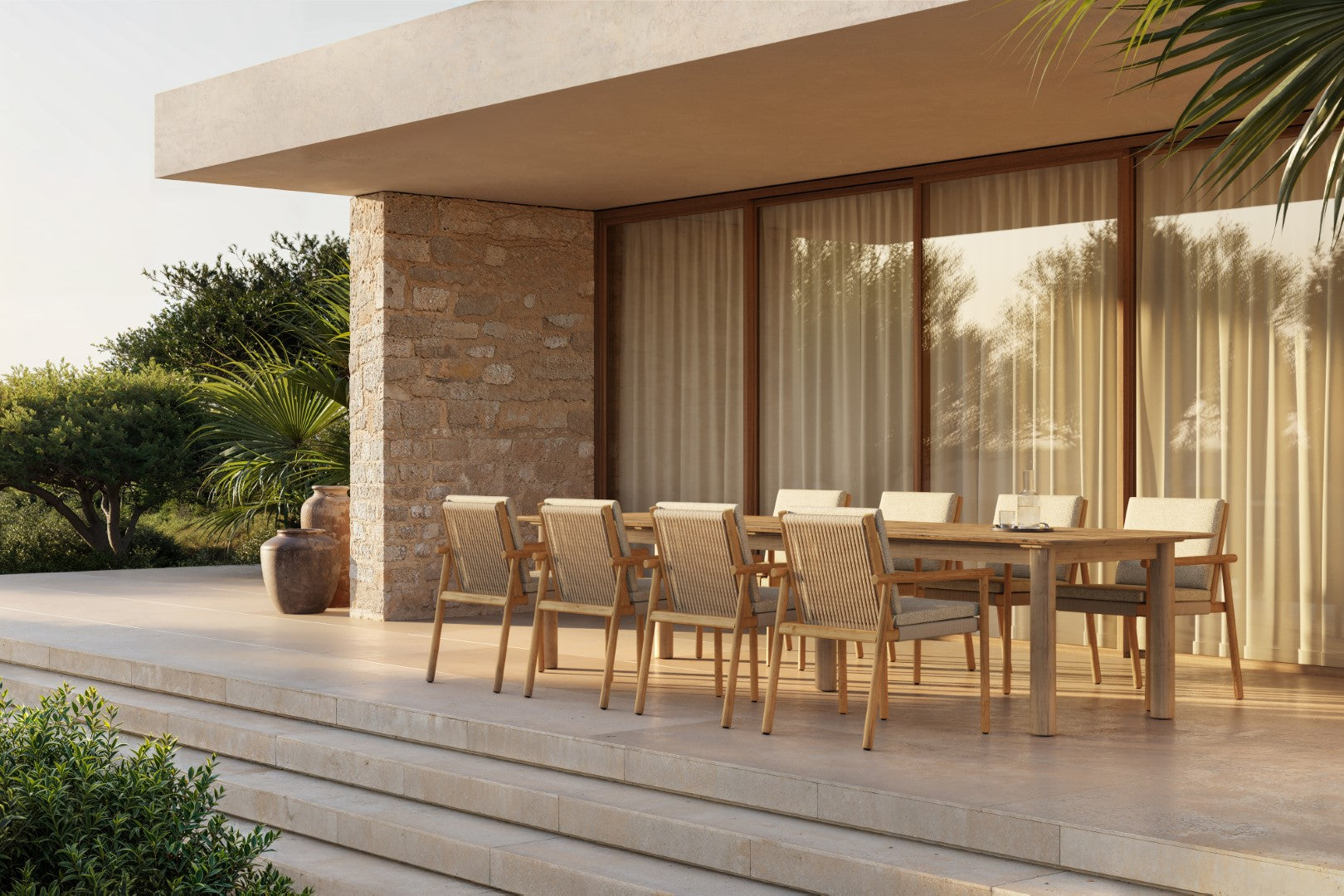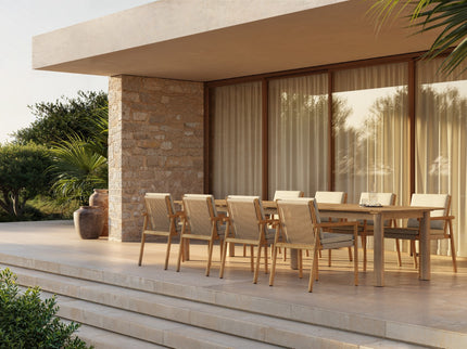- Een duurzaam frame van teak, met een verfijnde afwerking van rope in een zandkleur die de natuurlijke schoonheid van uw omgeving accentueert.
