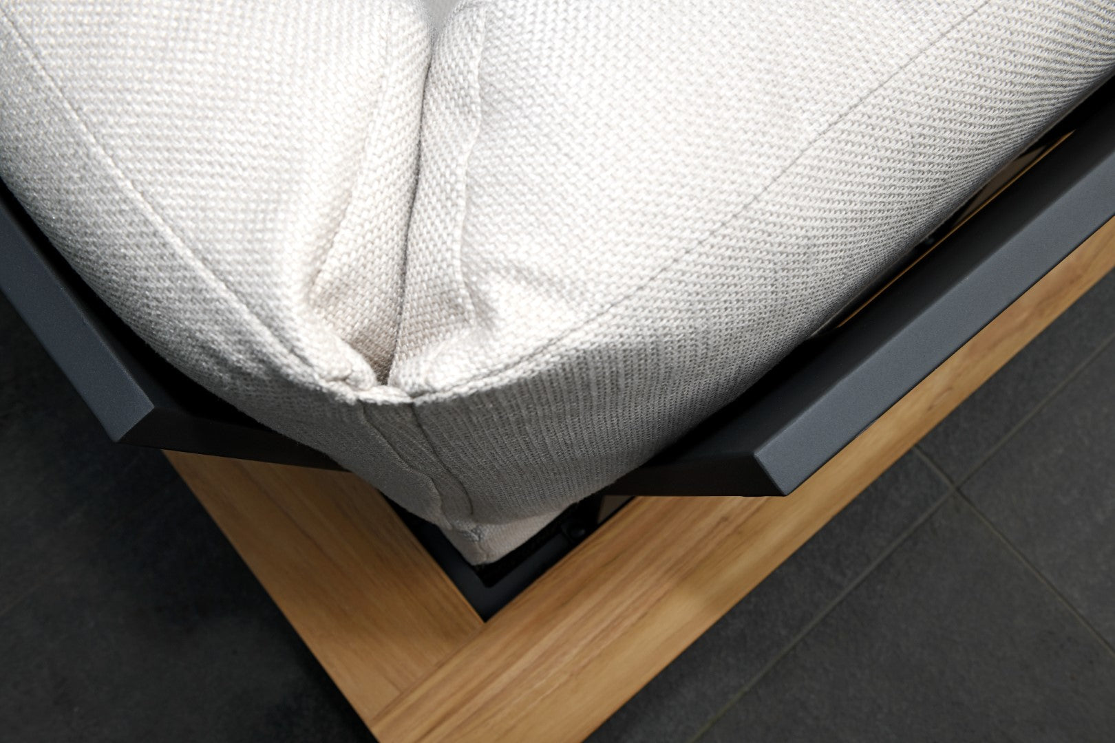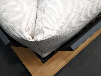 Het frame, vervaardigd uit hoogwaardig aluminium in een chique anthraciet kleur, biedt niet alleen een moderne uitstraling, maar is ook duurzaam en onderhoudsvriendelijk. De afwerking in teak voegt een warme touch toe, waardoor deze set perfect past in elke tuin of op elk terras.