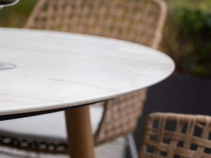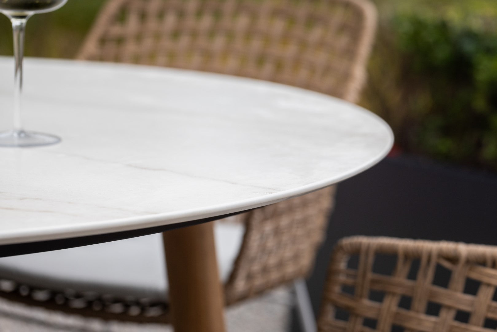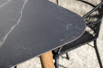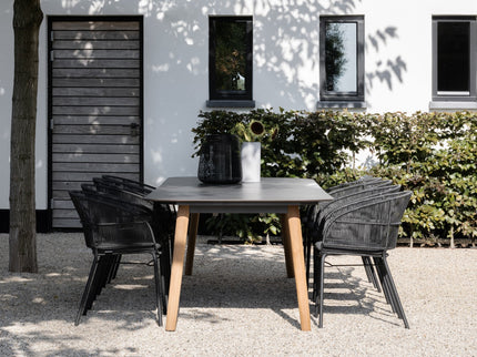 - De tafel is voorzien van stevige teak poten, die stabiliteit en stijl combineren.