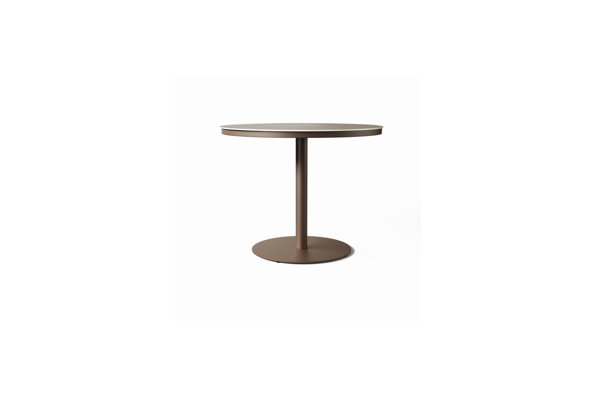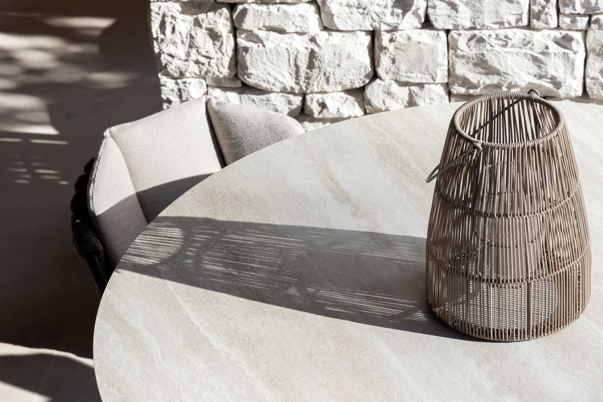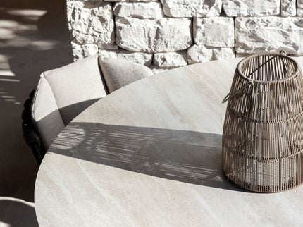 Deze tafel beschikt over een keramische top van travertin, wat niet alleen esthetisch aantrekkelijk is, maar ook duurzaam. Het aluminium frame is verkrijgbaar in twee prachtige kleuren: