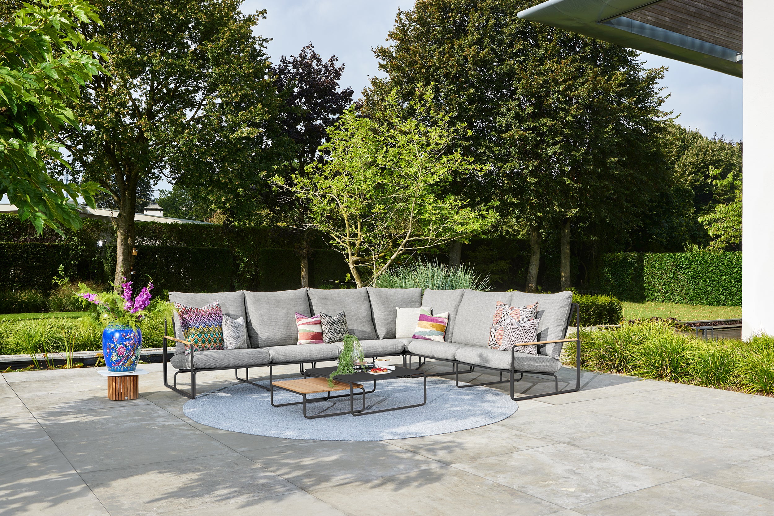 - Vijfdelige lounge set: bestaat uit een 2-zits links, 2-zits rechts, een hoekmodule, een lounge tafel met een teak top en een lounge tafel met een aluminium top.