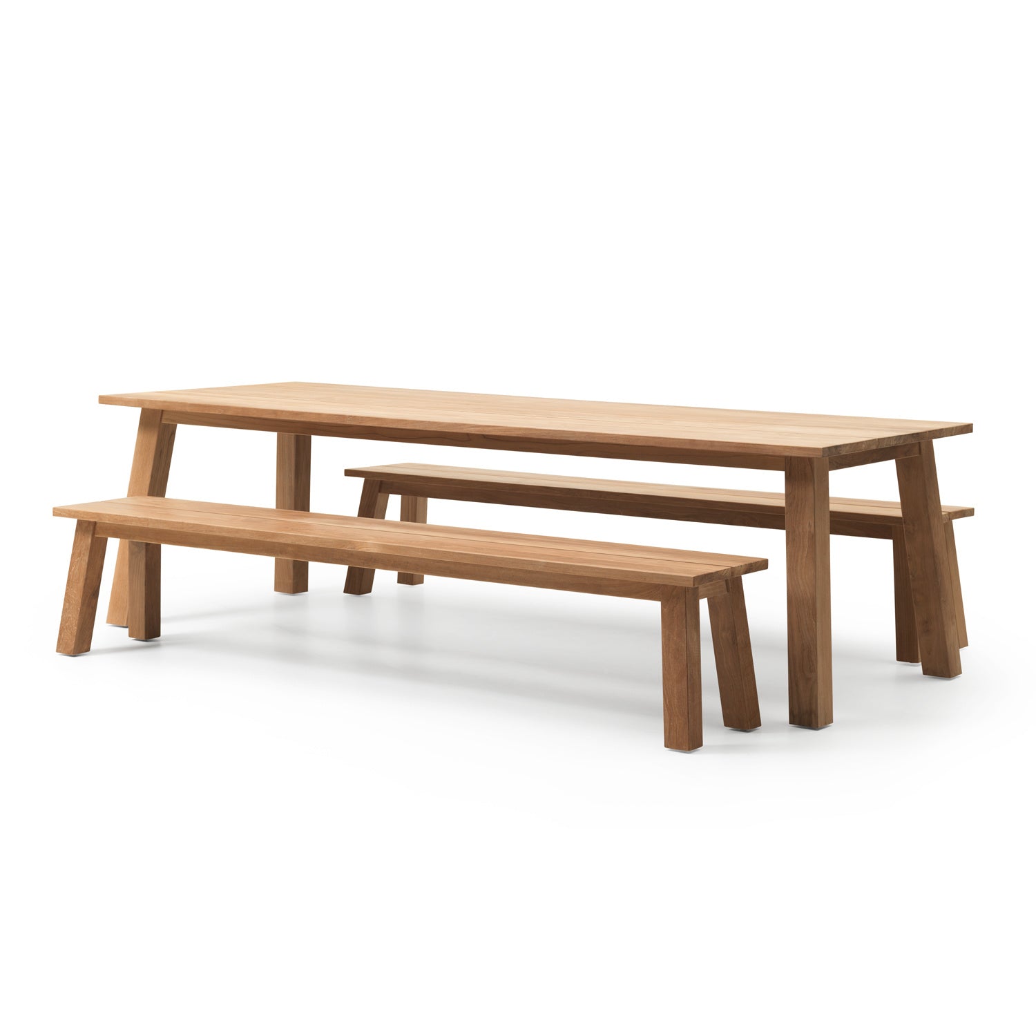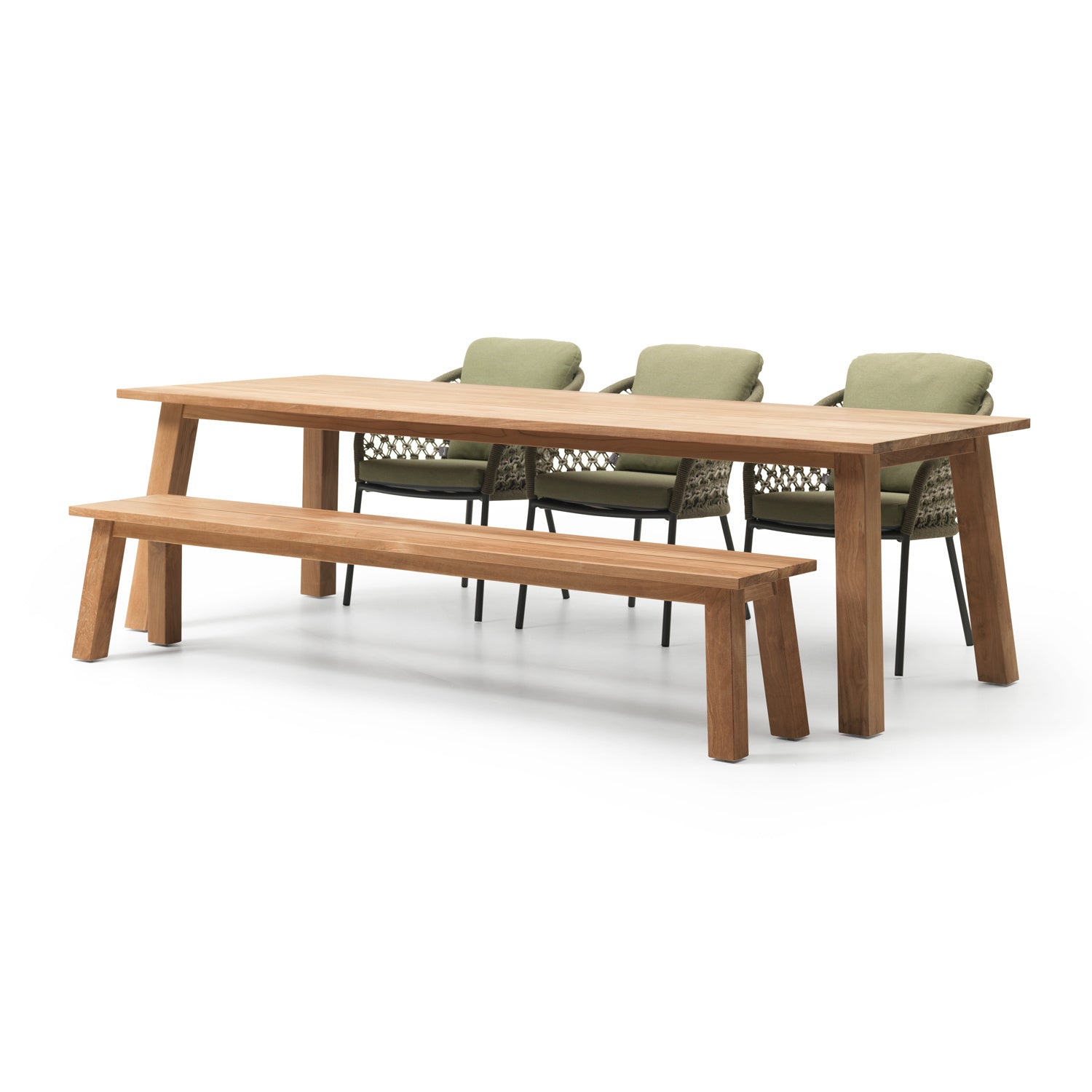 schuin uitlopende poten en een dik tafelblad met brede planken geeft je terras direct karakter.