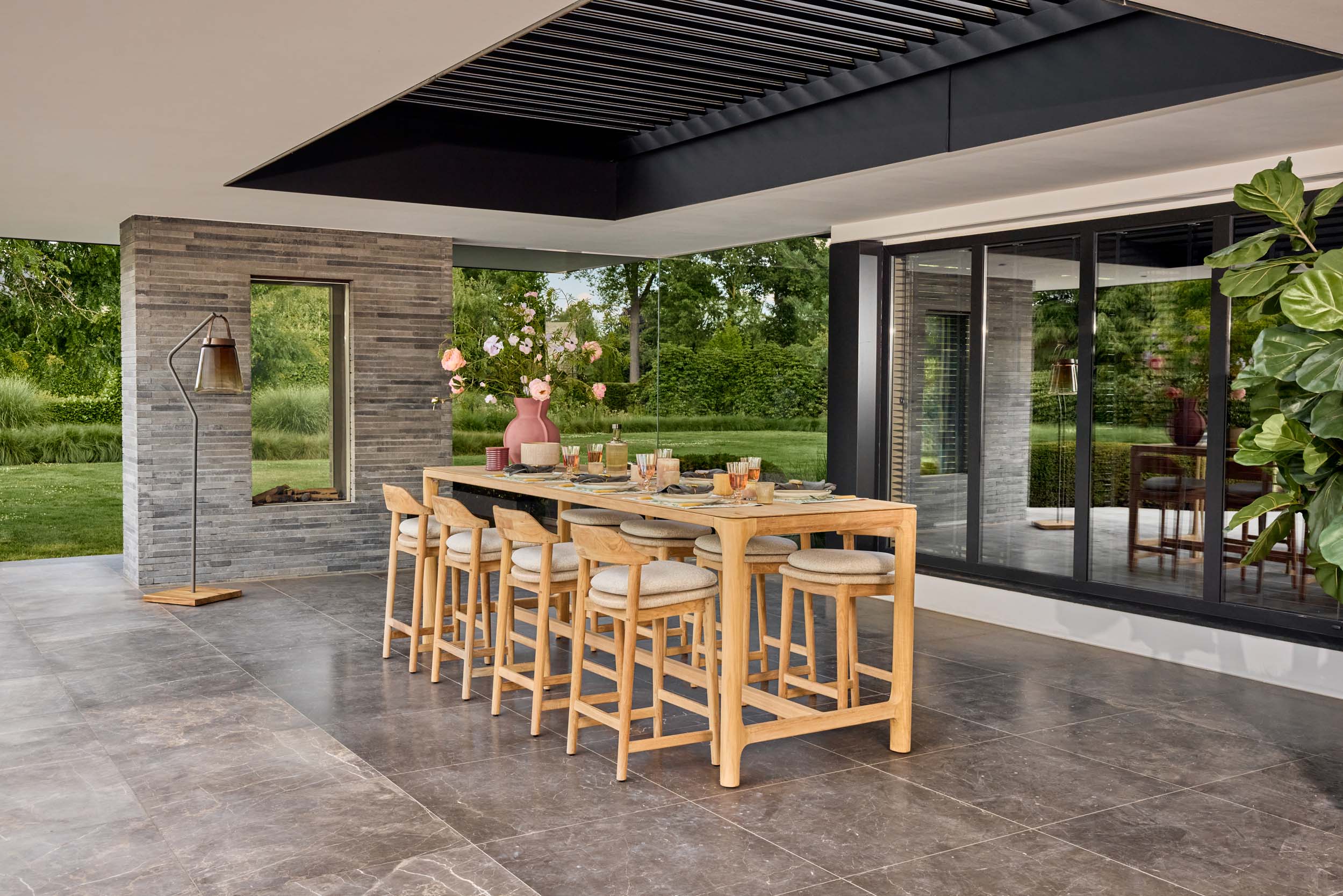 • Pemba Low Bar Table: Voor een uniforme en strakke uitstraling kies je de bijbehorende Pemba tafel. Deze is beschikbaar in lengtes van 230 cm of 290 cm, met een blad van warm teakhout of modern Neolith® stone grey.