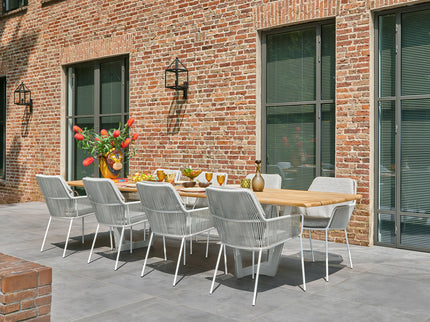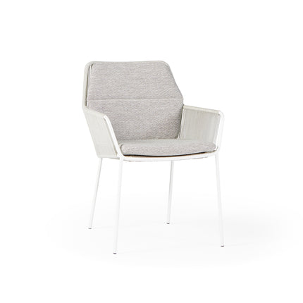 De Punta tuinstoel van SUNS is een prachtige tuinstoel met uitstekend zitcomfort. De Punta tuinstoel bestaat uit een combinatie van gepoedercoat aluminium, hoogwaardig rope en all-weather tuinkussens. Het frame van de Punta tuinstoel is gemaakt van gepoedercoat aluminium. Aluminium is ijzersterk, licht van gewicht en roest niet. De rug- en armleuningen van de Punta tuinstoel bestaat uit rope van hoogwaardige kwaliteit wat is gevlochten in een fishbone patroon. De meegeleverde tuinkussens van de Punta tuinstoel zijn gemaakt van all-weather stof. Deze stof beschikt over enkele bijzondere eigenschappen waaronder uv-bestendigheid en de kleurvastheid. We adviseren wel om de kussens naar binnen te halen bij veel regenval en in de winterperiode.