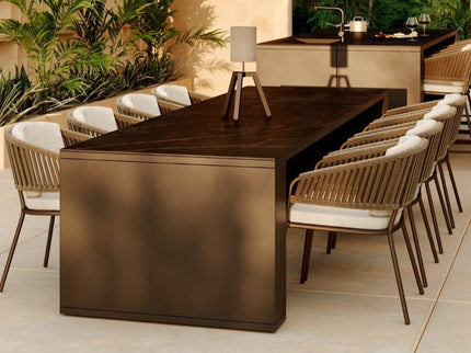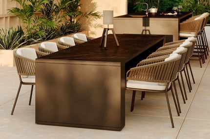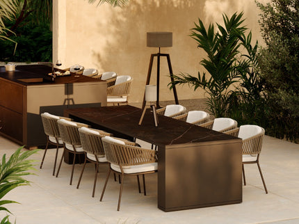 De comfortabele zittingen zijn van ‘belt’ gemaakt: een hoogwaardig synthetisch draad die door en door gekleurd is, waterafstotend, schimmelwerend en uv-bestendig. De mooie gemeleerde belt is in de warme kleur wengé beschikbaar. De Rob dining chair en high dining chair zijn kortom duurzaam, geschikt om lang in te zitten en een stijlvolle toevoeging aan het buitenleven.