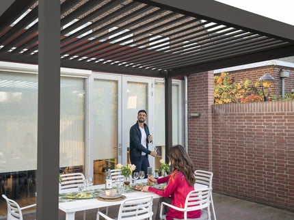 Deze terrasoverkapping is weerbestendig en met de flexibele shutters die als dak dienen, zit je droog in de regen en als je de shutters open draait heerlijk in het zonnetje! De bediening voor het open en dicht draaien van de shutters gaat bij de Rota handmatig en licht, dus geen gedoe met elektra aanleggen voor deze terrasoverkapping!