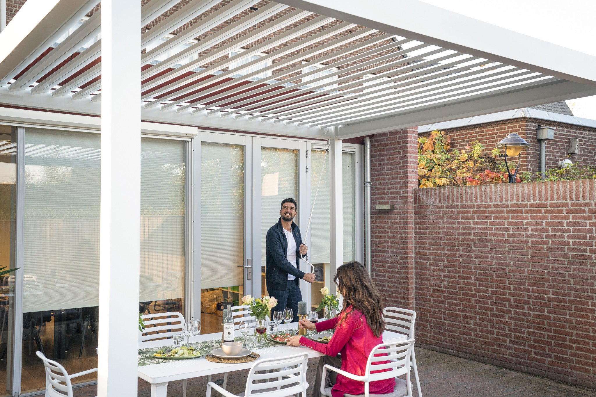 Deze terrasoverkapping is weerbestendig en met de flexibele shutters die als dak dienen, zit je droog in de regen en als je de shutters open draait heerlijk in het zonnetje! De bediening voor het open en dicht draaien van de shutters gaat bij de Rota handmatig en licht, dus geen gedoe met elektra aanleggen voor deze terrasoverkapping!