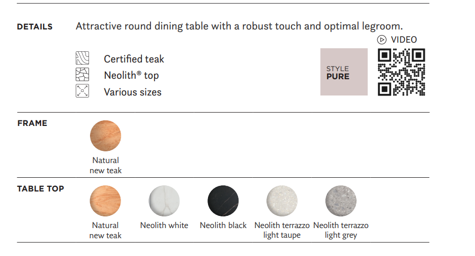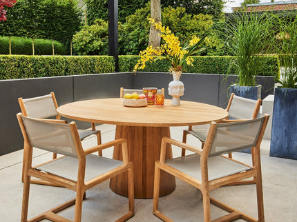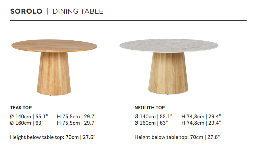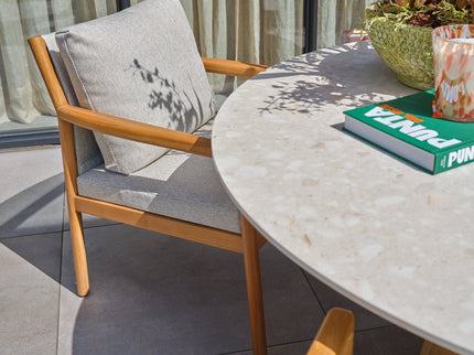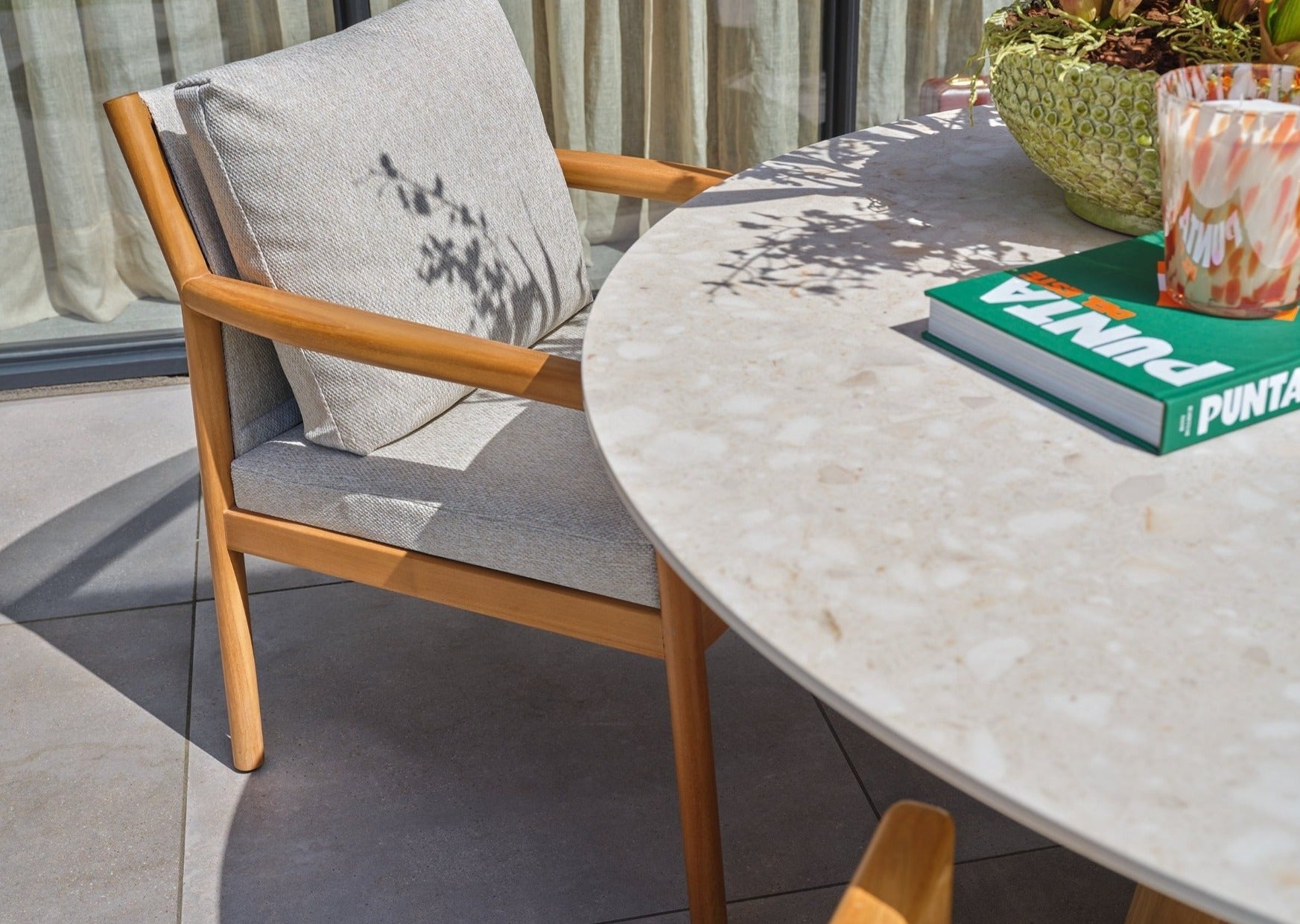 De Sorolo tuintafel is een ware eye-catcher. Het massieve teakhouten onderstel in combinatie met het Terrazo Neolith blad is uniek. De tuintafel is in 2 maten 140ø en 160ø cm verkrijgbaar en geschikt om het hele jaar buiten te laten staan.