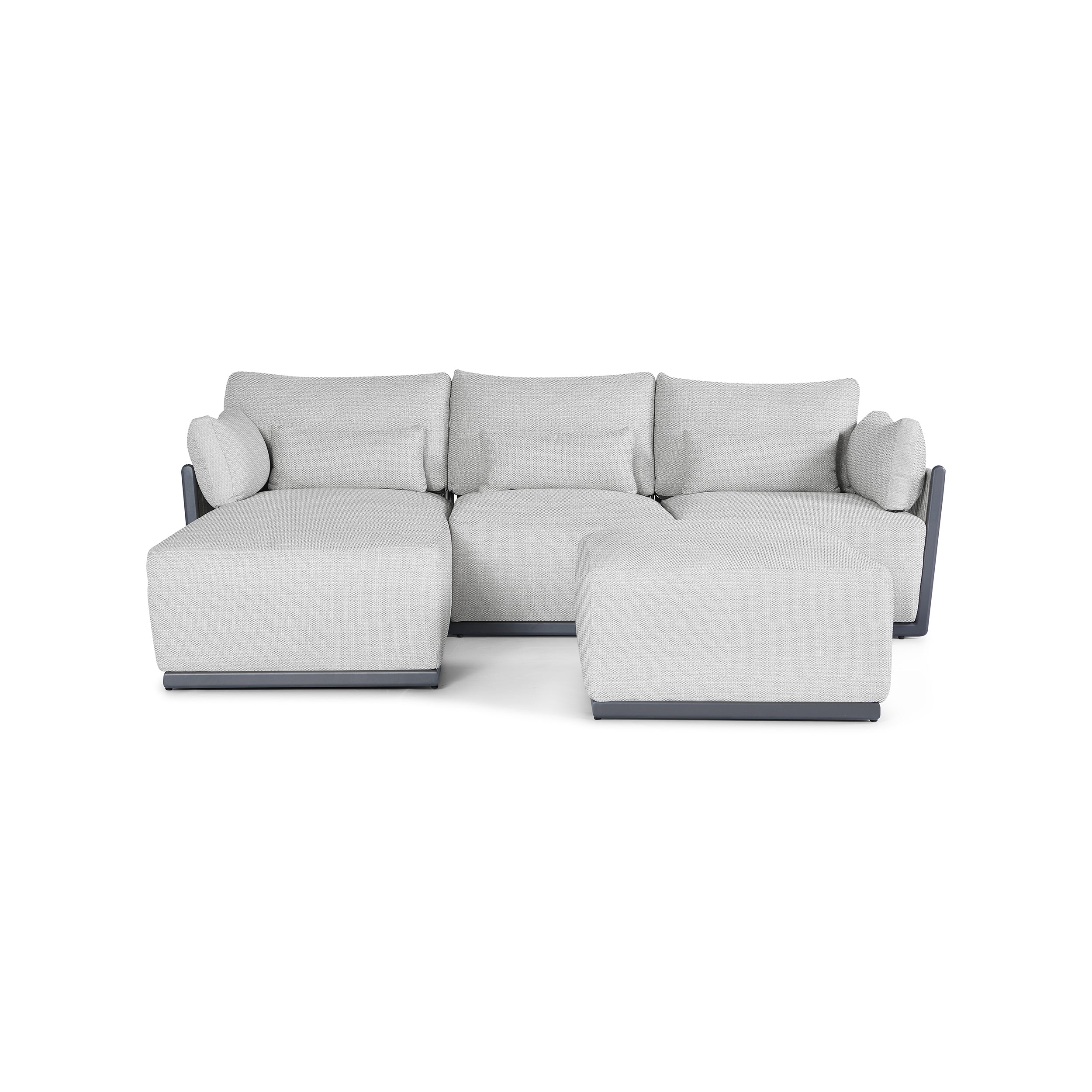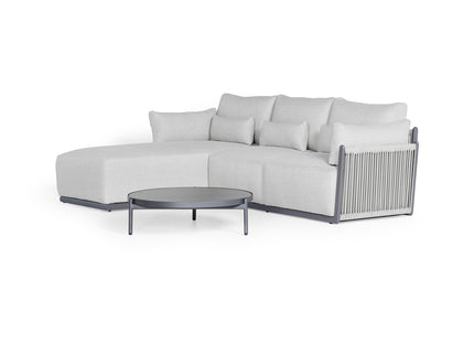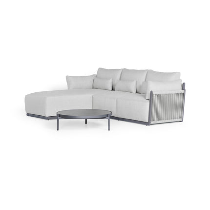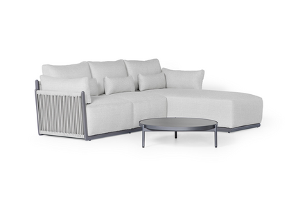 De Sorrento loungeset biedt een stijlvolle en comfortabele opstelling, perfect voor compacte buitenruimtes. Deze set bestaat uit een Chaise longue links of rechts, een 2-zitsbank, en een lounge tafel. Ontworpen met een uniek visgraat vlechtwerk dat luxe en duurzaamheid combineert. Inclusief comfortabele scatter kussens.