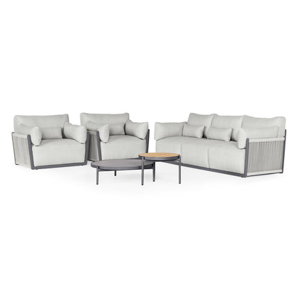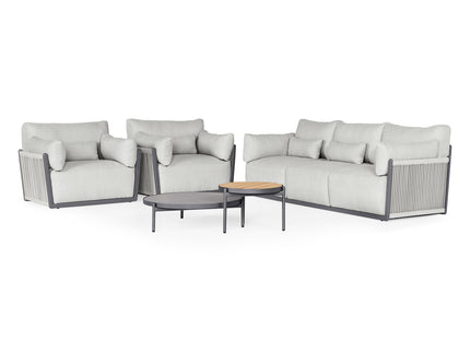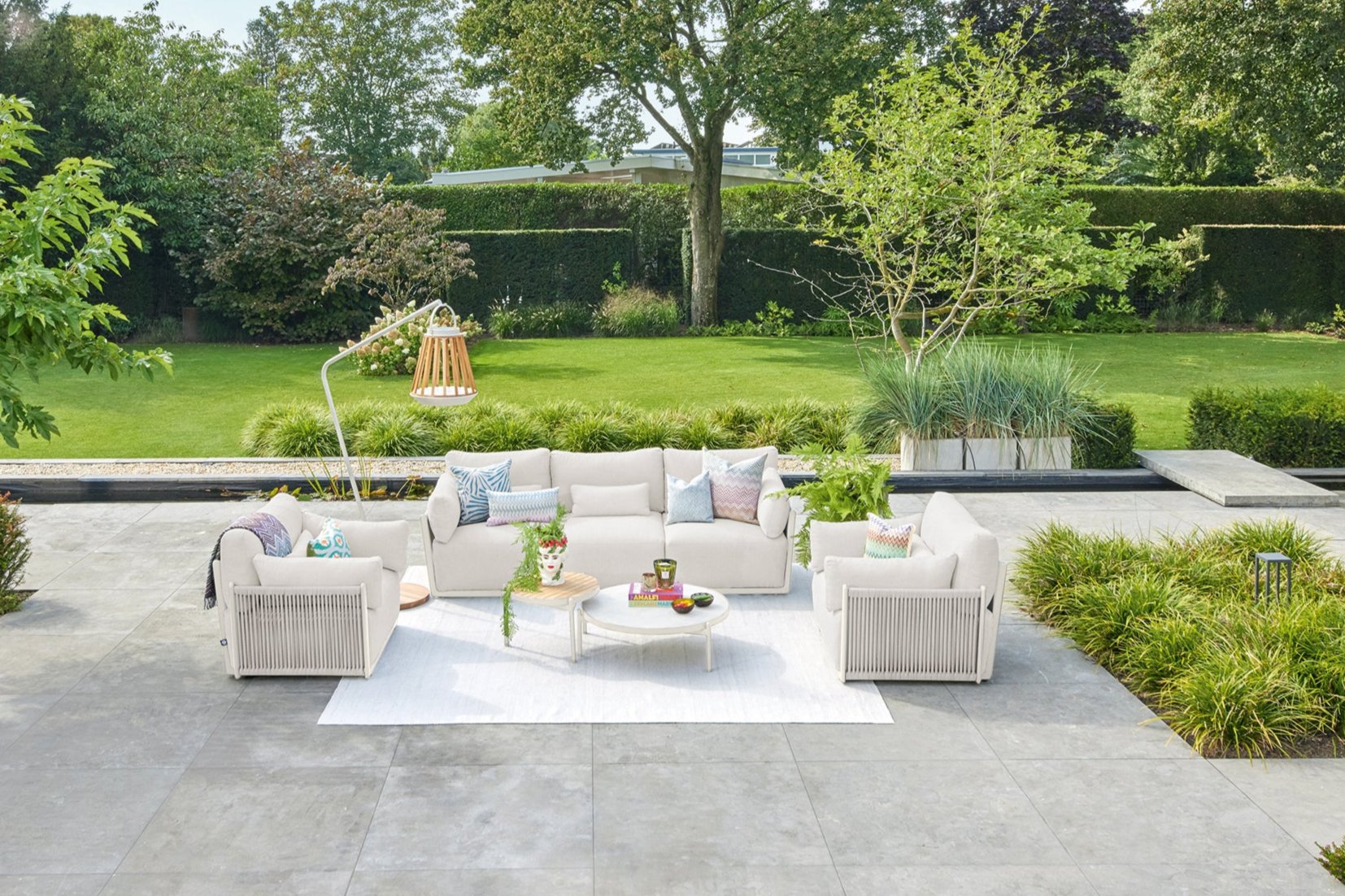 De set biedt een luxe uitstraling en hoog comfort, terwijl de materialen weerbestendig en onderhoudsvriendelijk zijn. Combineer de set met een lounge tafel uit dezelfde serie voor een complete buitenervaring.
