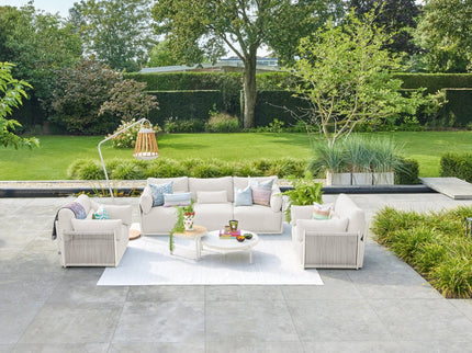 De Sorrento sofa set biedt een stijlvolle en comfortabele, perfect voor compacte buitenruimtes. Deze set bestaat uit een 3-zitsbank, 2x lounge stoel en en een lounge tafels. Ontworpen met een uniek visgraat vlechtwerk dat luxe en duurzaamheid combineert. Inclusief comfortabele scatter kussens.
