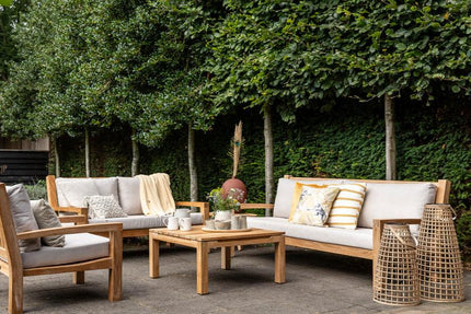 Teakhout is een natuurproduct en zal het hout uitzetten en krimpen door de luchtvochtigheid. Hierdoor bestaat de mogelijkheid dat er (kleine) haarscheurtjes ontstaan en eventueel wat kromming van de planken. Om het hout te beschermen kun je een teak shield gebruiken. Hierdoor zal de vergrijzing van het hout doorgaan, maar bescherm je het hout tegen weersinvloeden en ander vuil. Schoonmaken van het hout kan met een teakcleaner, hier zul je gemakkelijk al het vuil en evt. Beschermlagen mee verwijderen. Voor het onderhoud van de kussens raden we de Textiel cleaner en protector aan. Zie voor verdere informatie over onderhoud het kopje “Alles over tuinmeubelen” / tuinmeubel onderhoud op onze website!