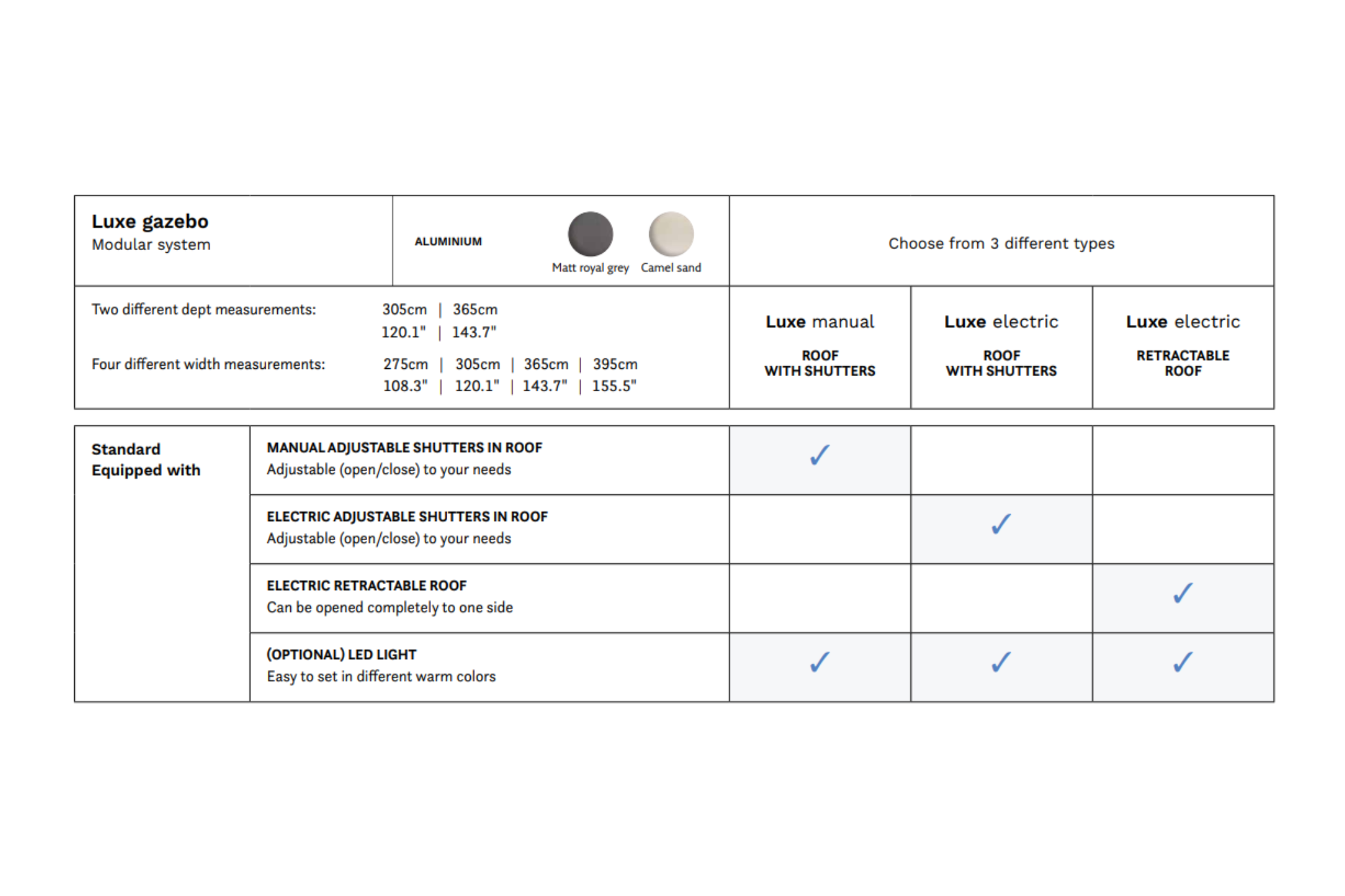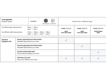 Vervaardigd uit hoogwaardig aluminium, staat de SUNS Luxe Gazebo garant voor een duurzame en onderhoudsvriendelijke oplossing. Deze prachtige overkapping is beschikbaar in de chique kleuren Matt Royal Grey en Camel Sand, waardoor je kunt kiezen wat het beste aansluit bij jouw stijl en voorkeuren.