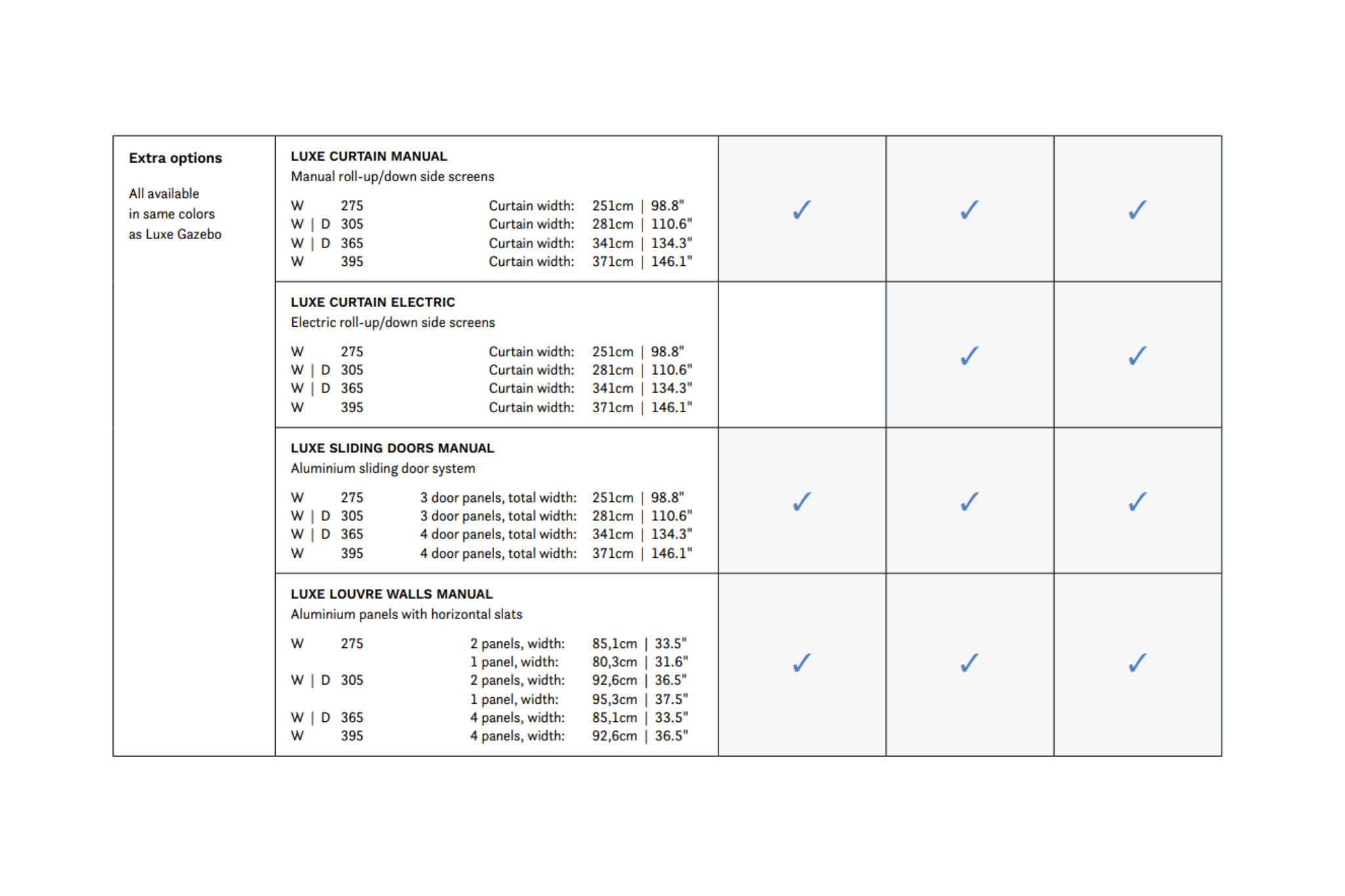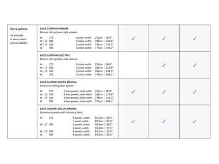 De basis van de SUNS Luxe Gazebo is beschikbaar in verschillende formaten, allemaal met een hoogte van 250 cm. Je kunt kiezen uit twee breedtes: