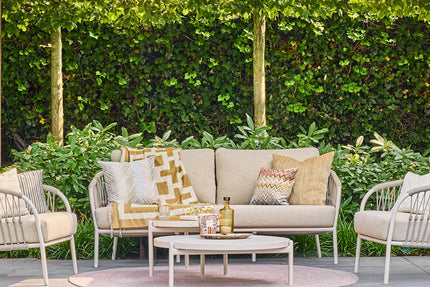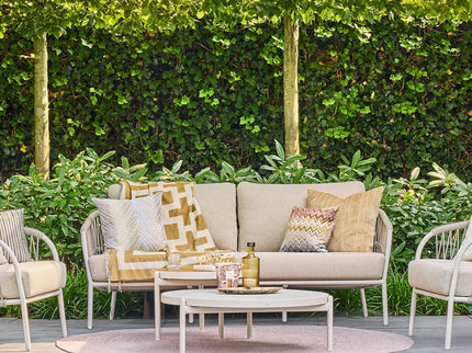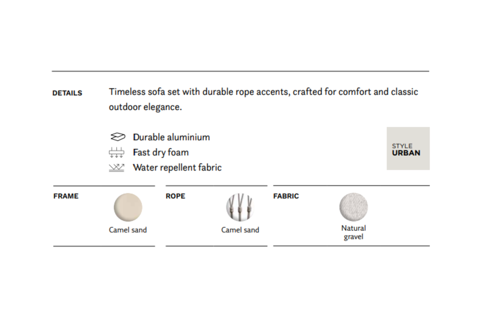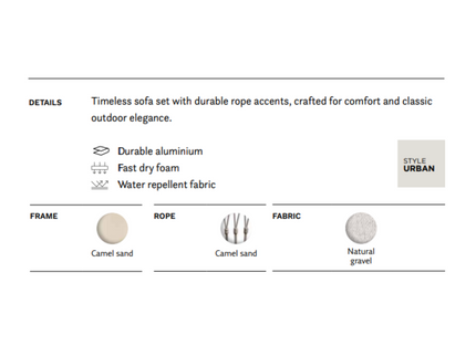 Met zijn prachtige camel sand kleur, zowel in het touw als in het frame, brengt de Nappa Sofa een warme uitstraling in elke ruimte. De kussens zijn bekleed met een luxe natural gravel stof, wat zorgt voor een subtiele maar stijlvolle contrast.