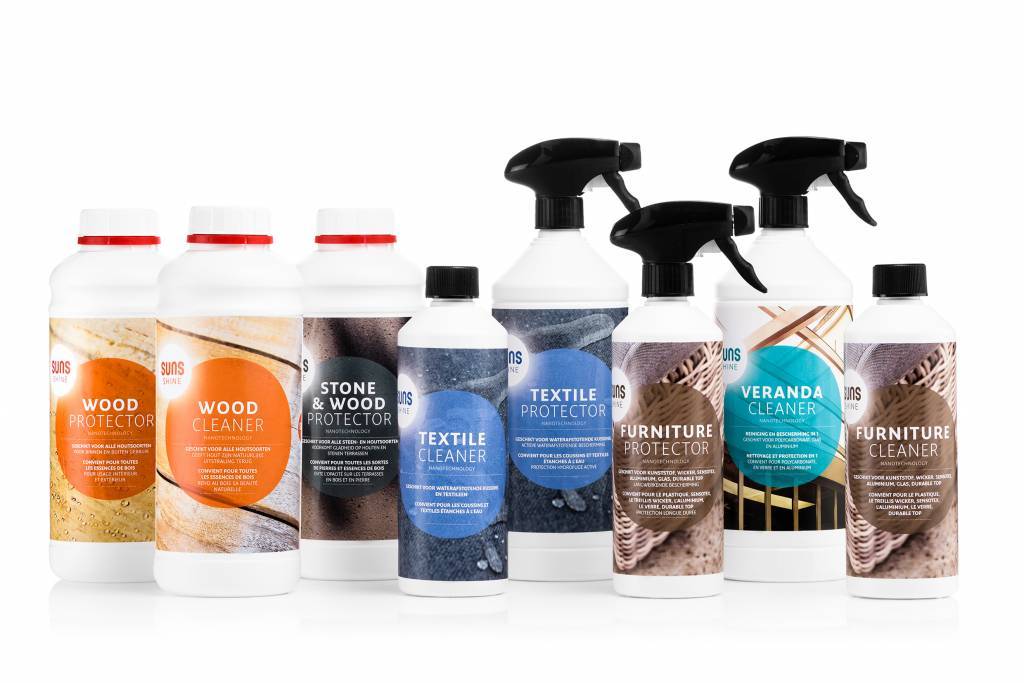 SUNS furniture cleaner is een speciaal ontwikkelde schoonmaakproduct van SUNS. De cleaner is gemaakt voor het reinigen en beschermen van diverse hardere materialen zoals kunststof, wicker, SensoTex, aluminium, glas en durable top. De furniturecleaner van SUNS bevat nano-technologie. Dit is een actieve bescherming laag dat voor langdurige effect zal zorgen. De cleaner heeft een sterk reinigende werking en daarnaast ook een antistatische en vuilafstotende eigenschap. Het product werkt snel en gemakkelijk!