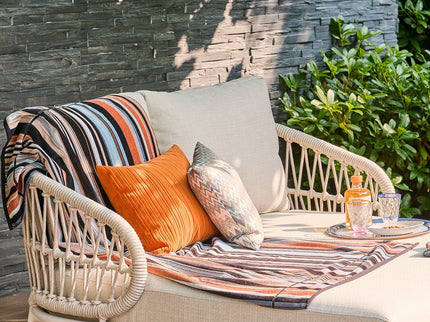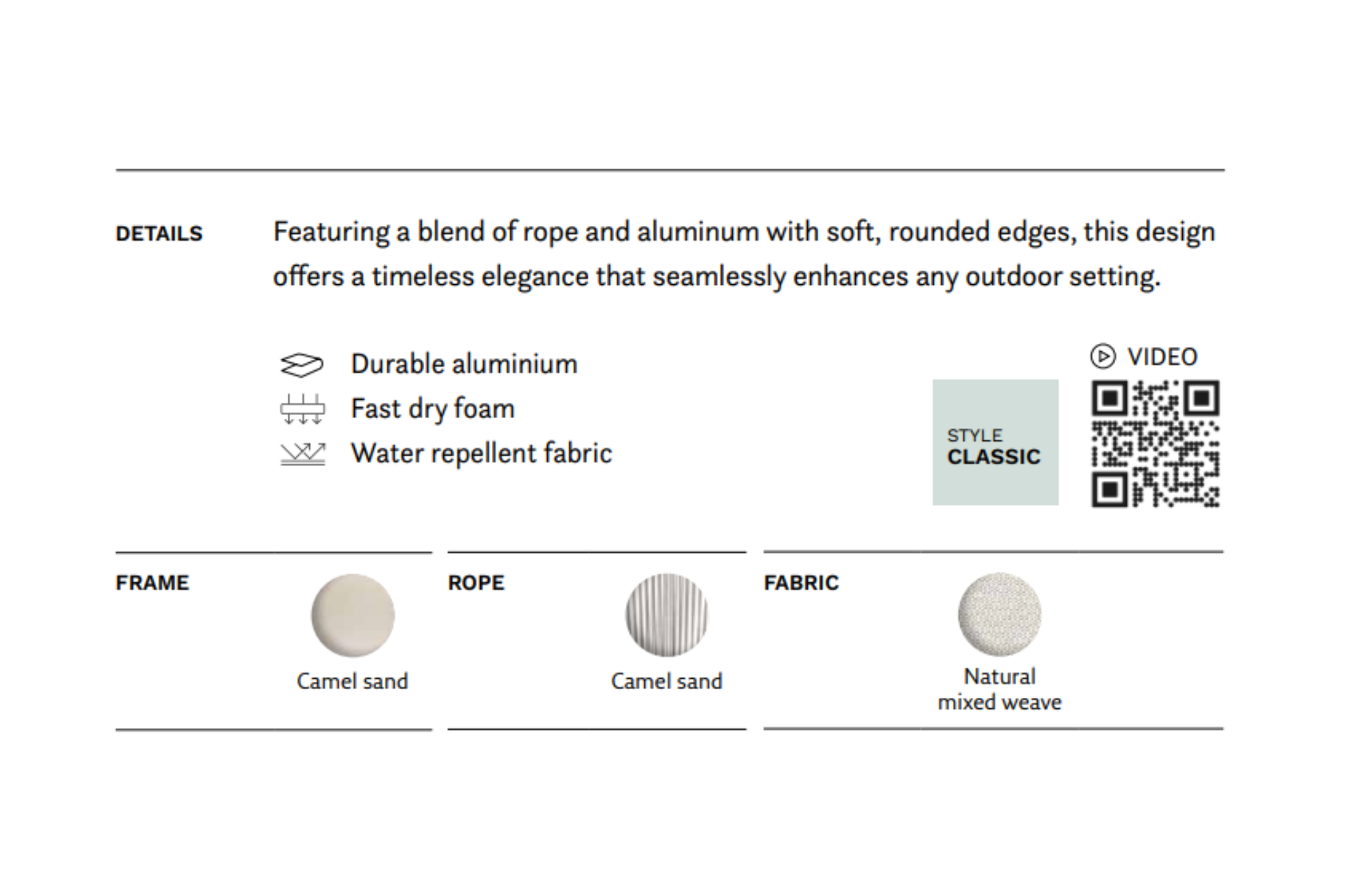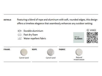 - Het frame in camel sand, afgewerkt met hoogwaardige rope in dezelfde tint, voegt een warm accent toe aan uw terras.