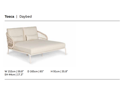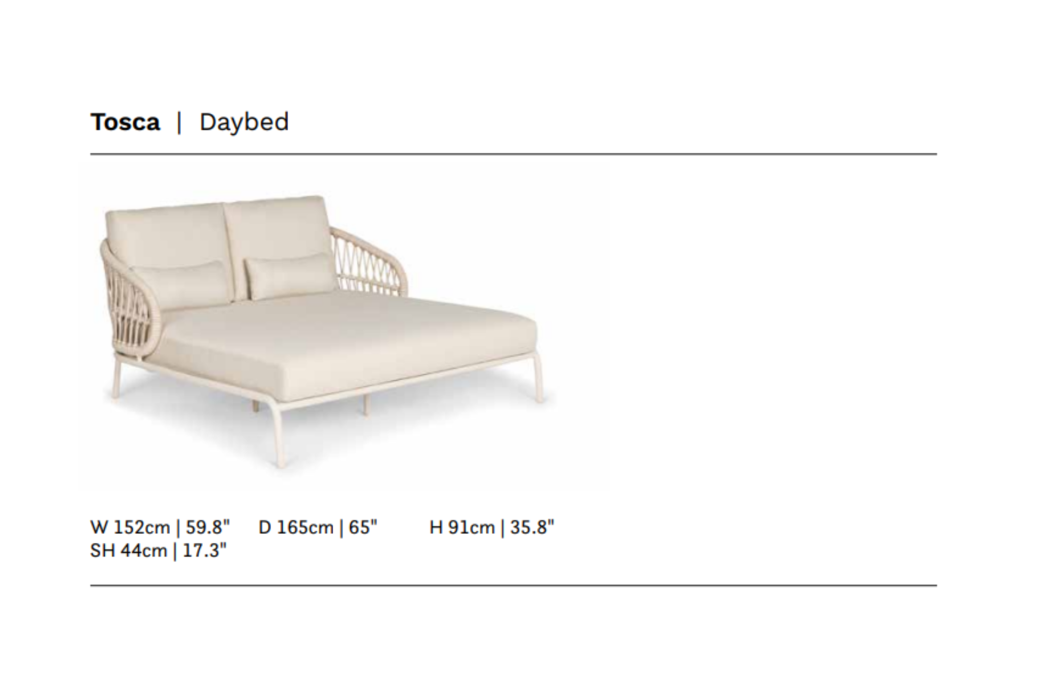 Met een afmeting van W 152 cm, D 165 cm en H 91 cm is de SUNS Tosca Daybed de perfecte oplossing om prachtige lounge sets te creëren, zodat u het hele jaar door kunt genieten van uw buitenleven.