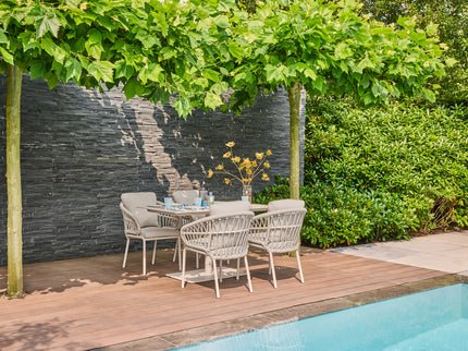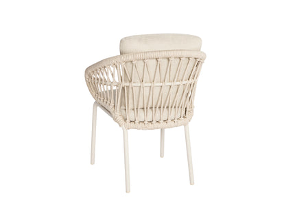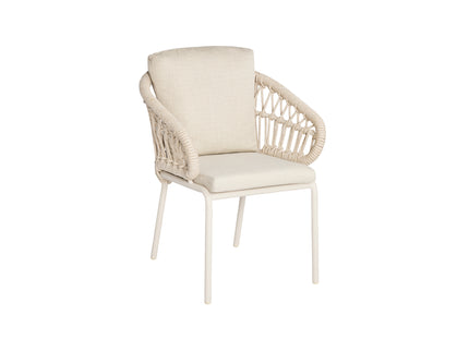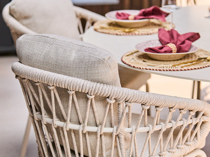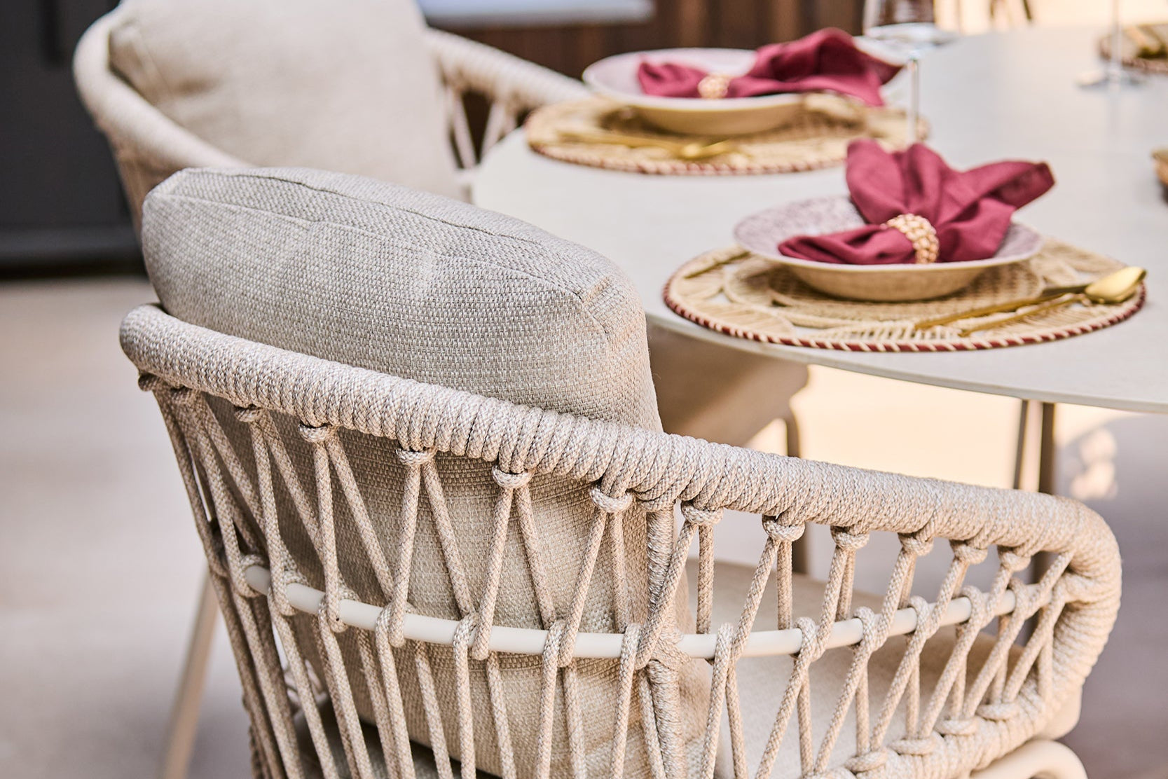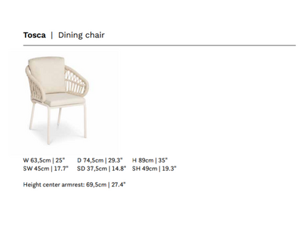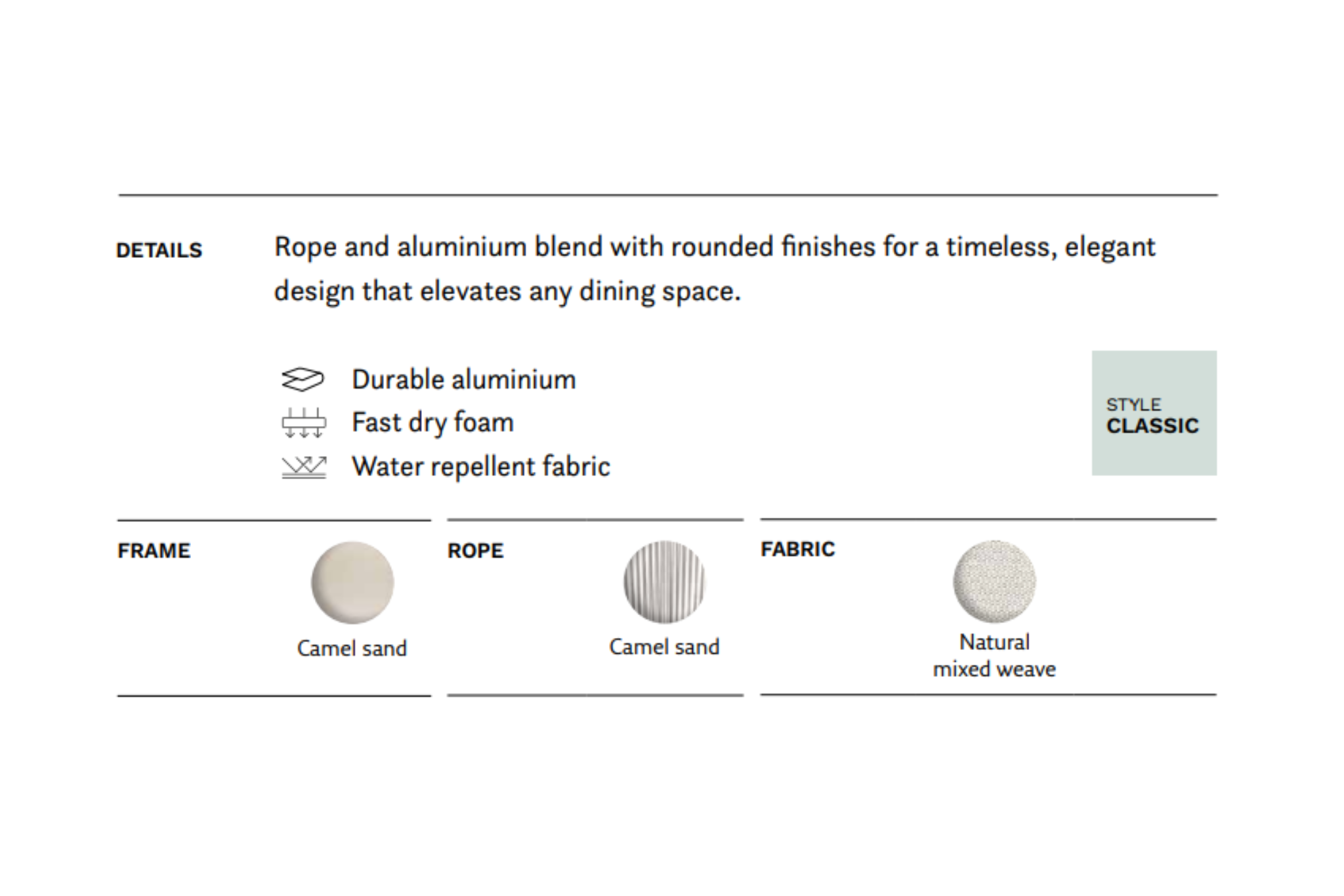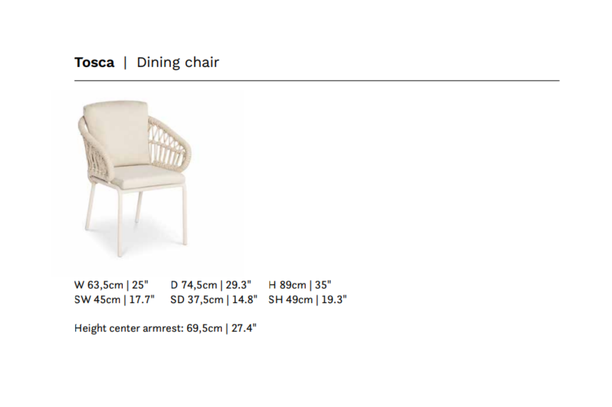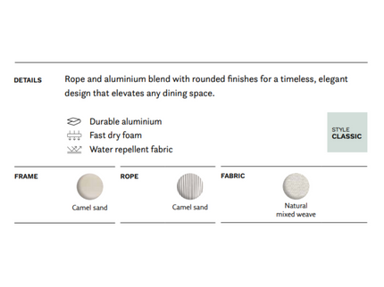 De Tosca dinerstoel heeft een verfijnd camel Sand frame, afgewerkt met een elegant rope in dezelfde warme tint. Dit creëert een stijlvolle uitstraling die zich moeiteloos aanpast aan diverse interieurstijlen. De kussens, vervaardigd in een natuurlijke mixed weave, bieden niet alleen luxe, maar ook ultiem comfort.